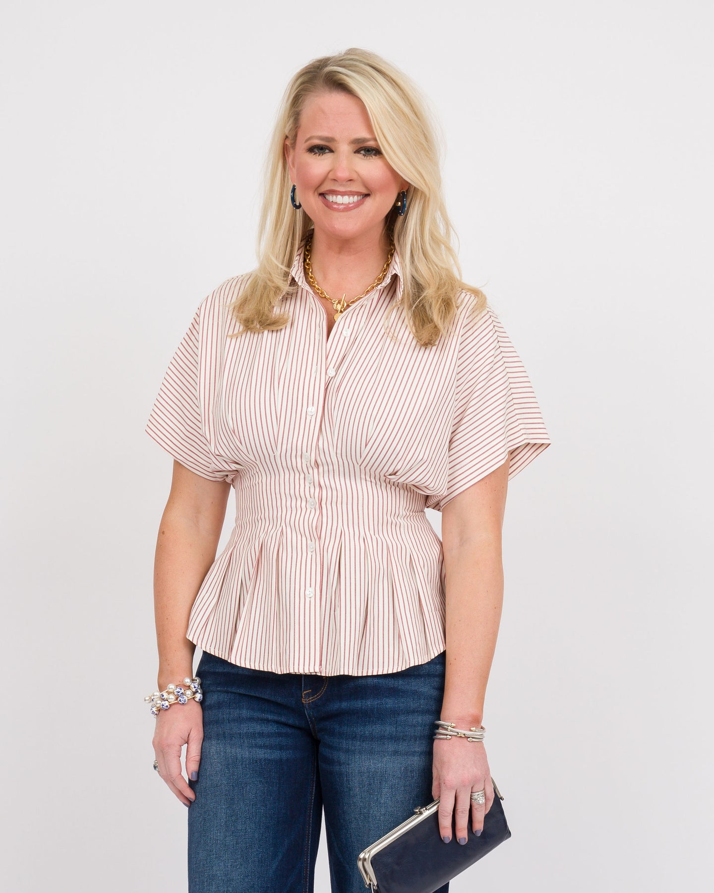 This short sleeve button down top features a collared neckline, vertical stripe pattern, wide draped sleeves, a cinched waist with pleated detailing, and a flared peplum hem for a polished yet feminine silhouette.