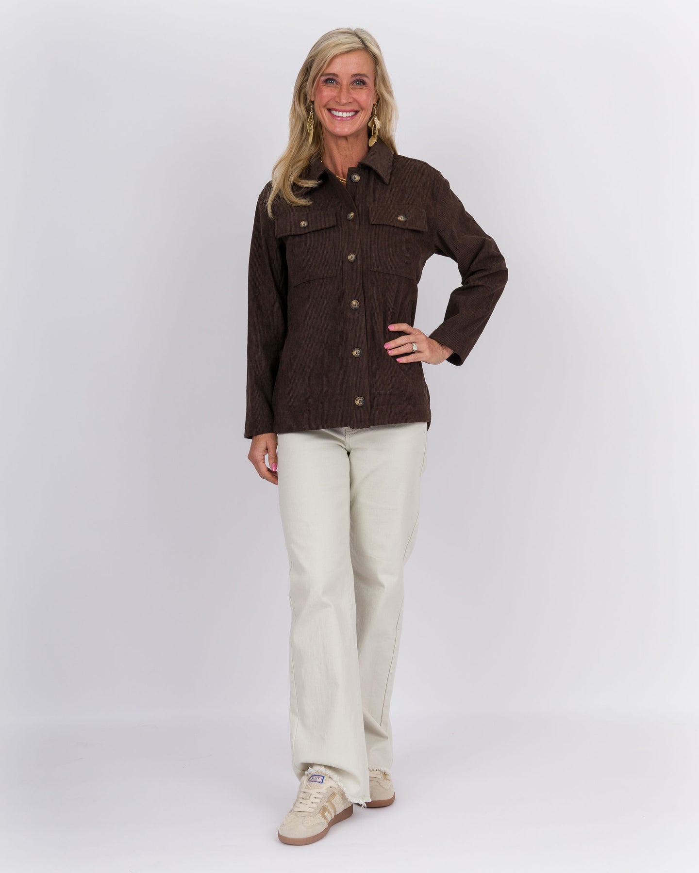 The Annissa Shacket in Timber Brown combines the warmth of a jacket with the comfort of a shirt, perfect for layering in cooler weather. Featuring a classic collar and front pockets, it offers both style and practicality for everyday wear. Its button-down design makes it easy to dress up or down for any occasion.