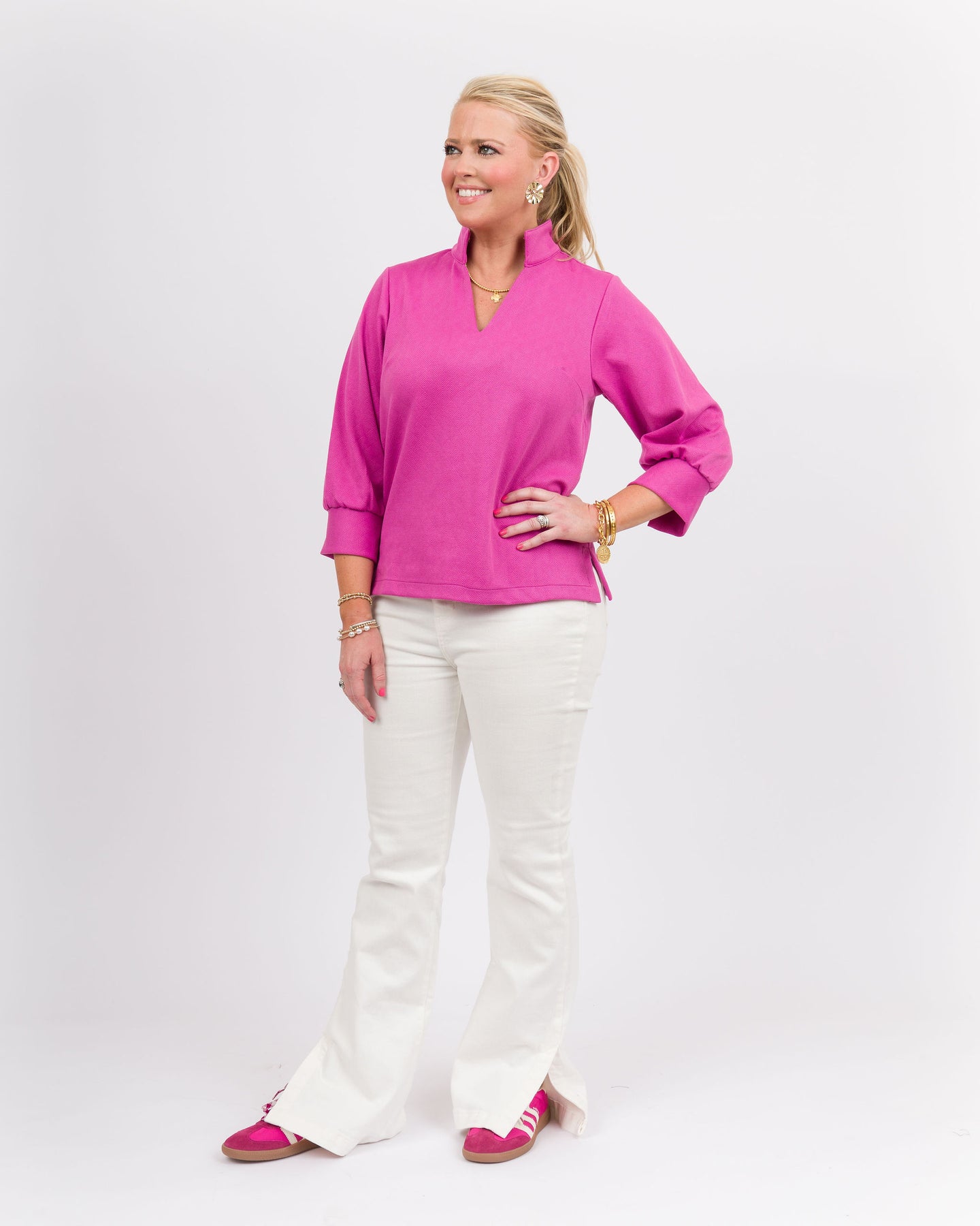 The Jocelyn Top features a flattering V-neckline and stylish cuff sleeves that add a touch of sophistication to your look. Its comfortable fit makes it perfect for both casual outings and dressier occasions. Elevate your wardrobe with this versatile and chic piece.