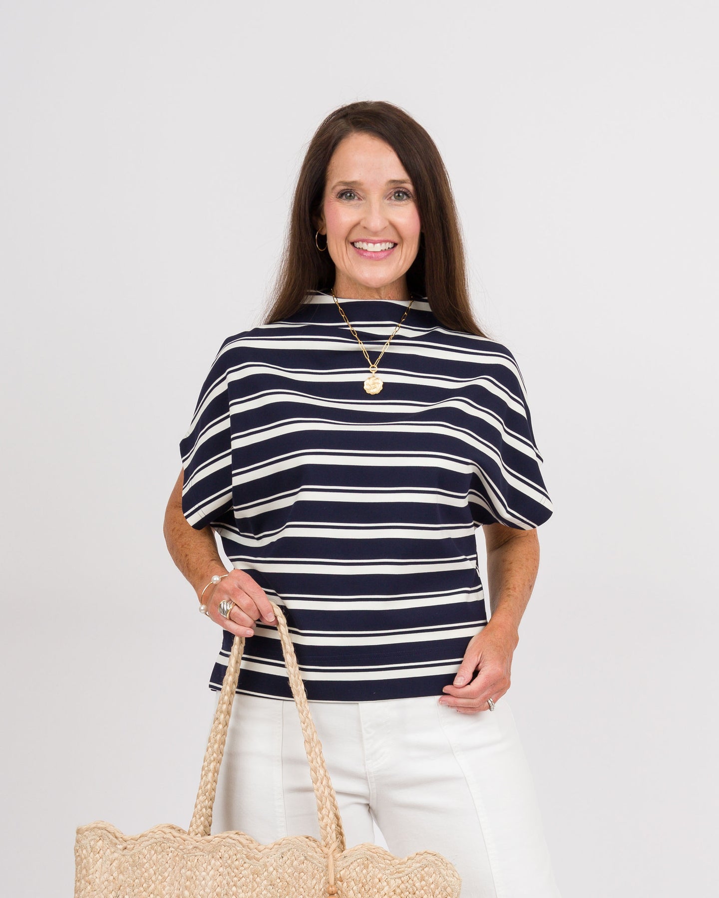 This short sleeve top features a relaxed boxy silhouette with dropped shoulders, a wide mock neckline, and bold horizontal stripes for a casual yet polished look.