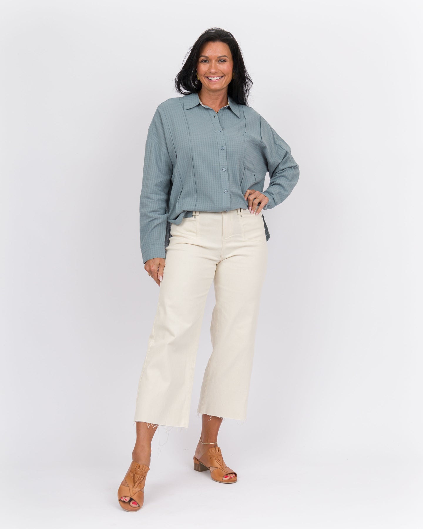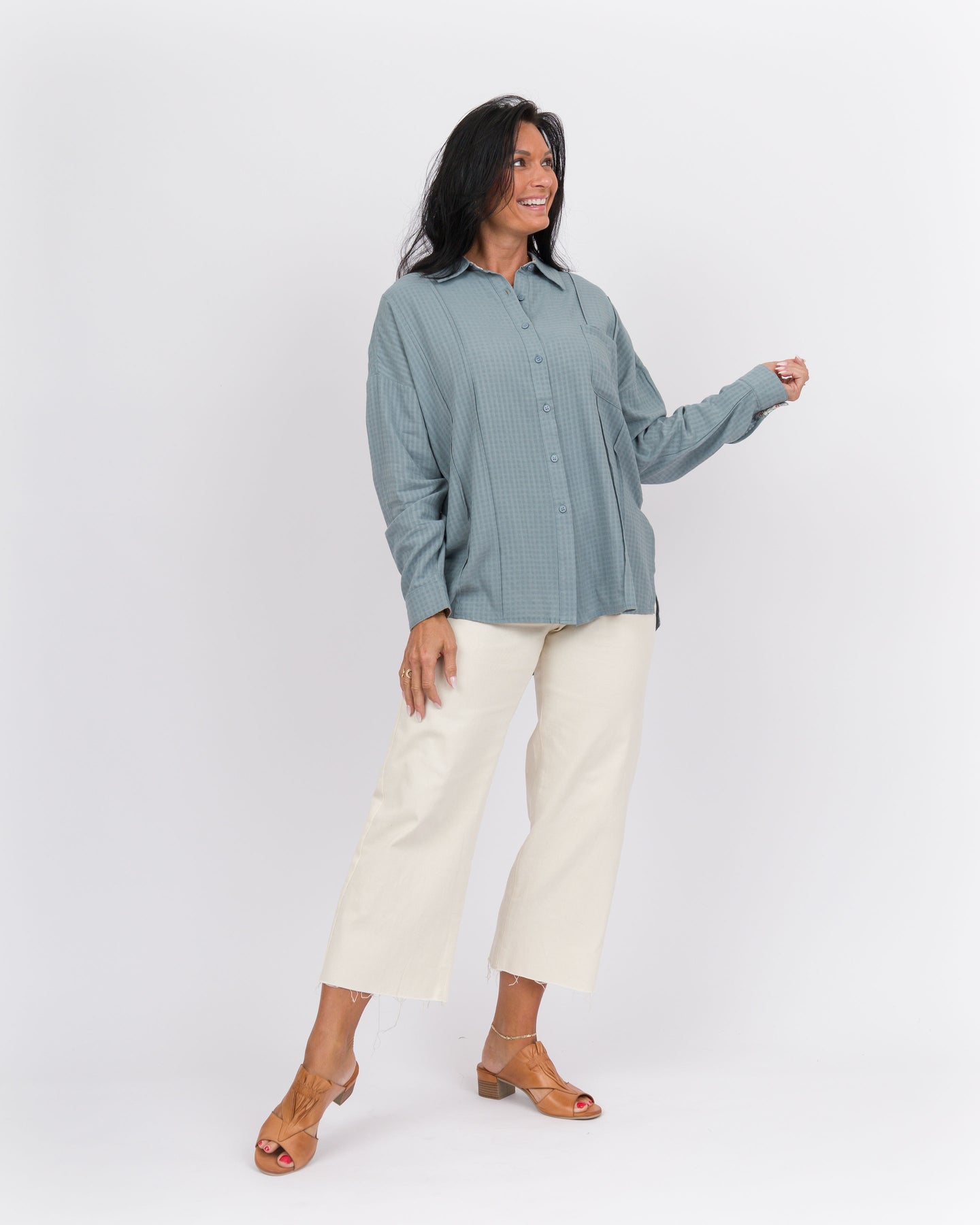 This Plaid Button Down Top in blue and grey features a classic long sleeve design with a crisp collar, perfect for layering or wearing on its own. Its timeless pattern adds a touch of casual sophistication to any outfit. Comfortable and versatile, it’s an ideal choice for both workdays and weekend outings.