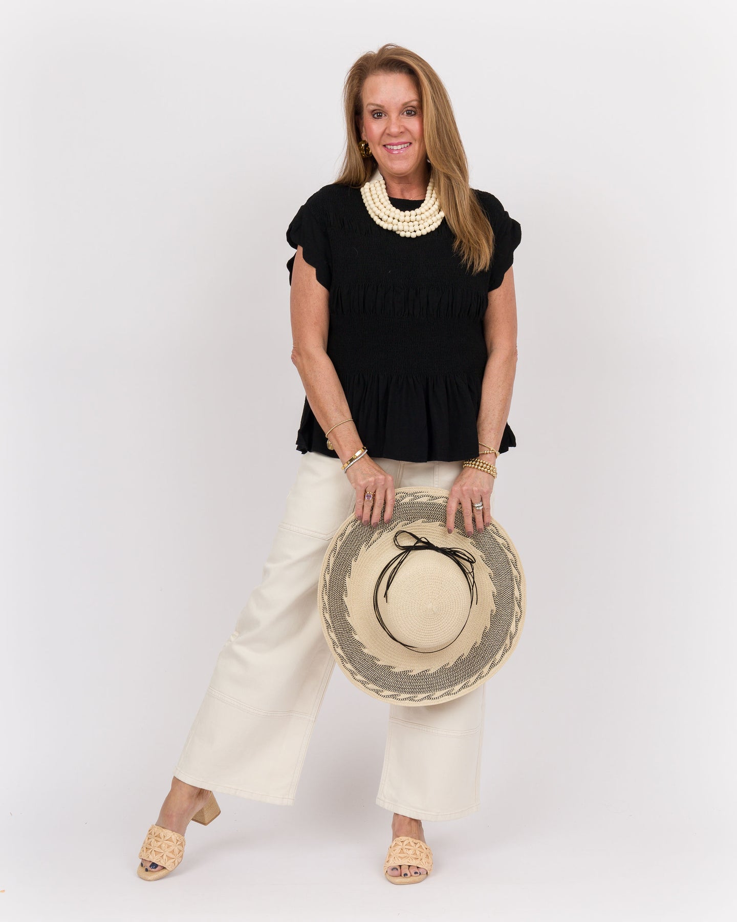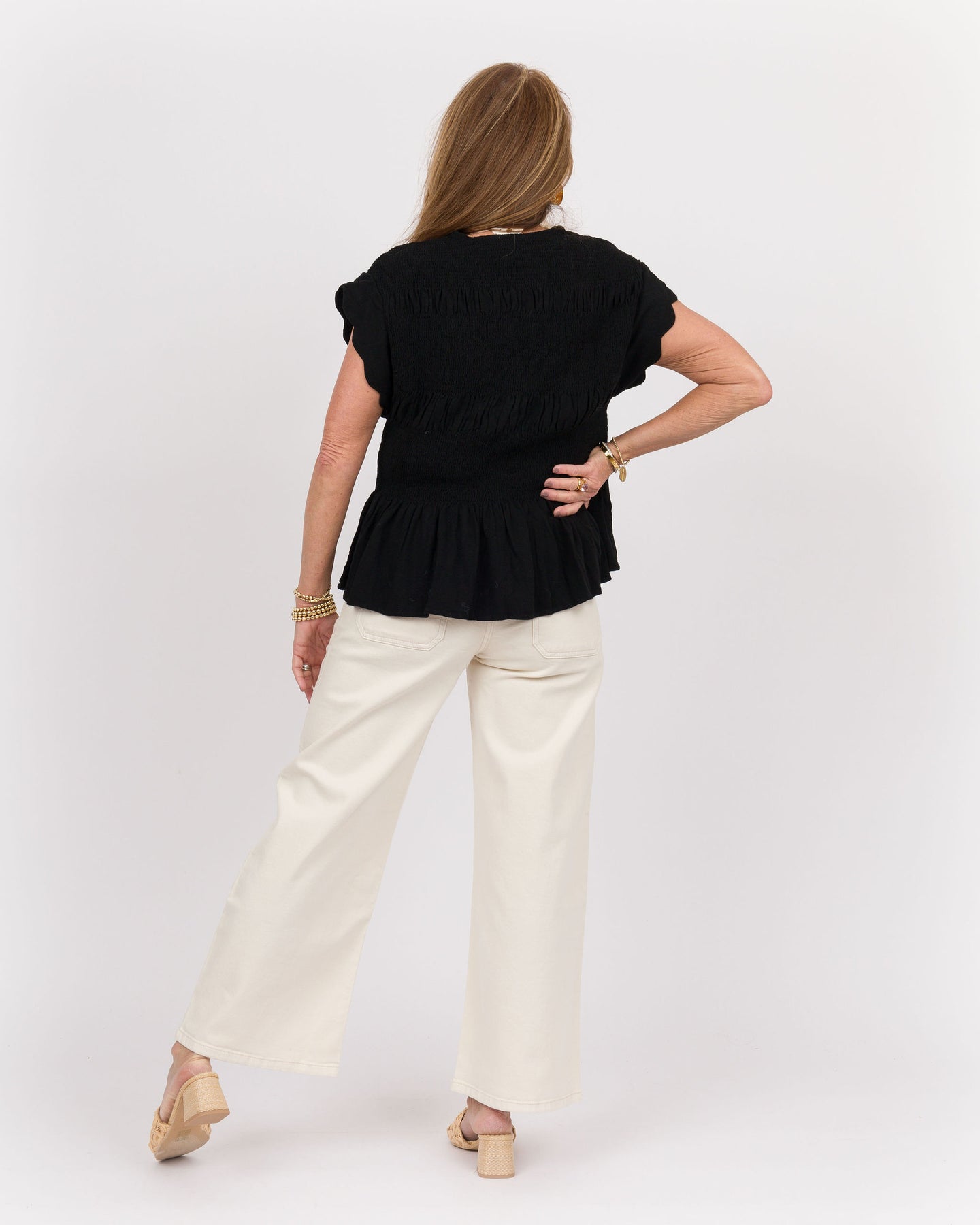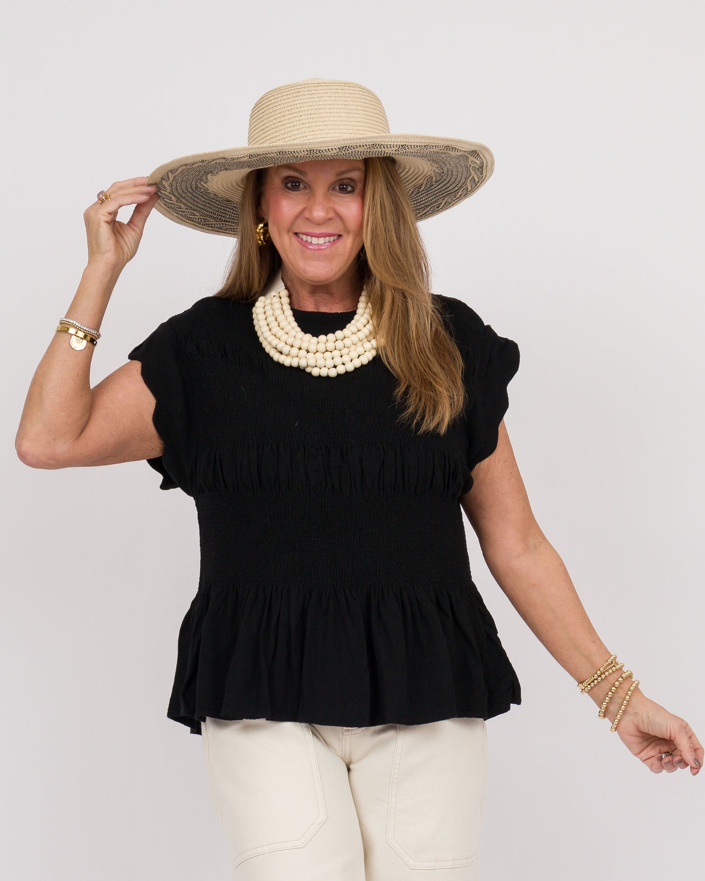 This black peplum top blends comfort with contemporary style, crafted from a breathable linen blend fabric. The smocked bodice creates flattering definition, while scallop-edge short sleeves and a ruffled peplum hem add playful movement and dimension. Perfect for elevating casual outfits or dressing up for weekend occasions.
