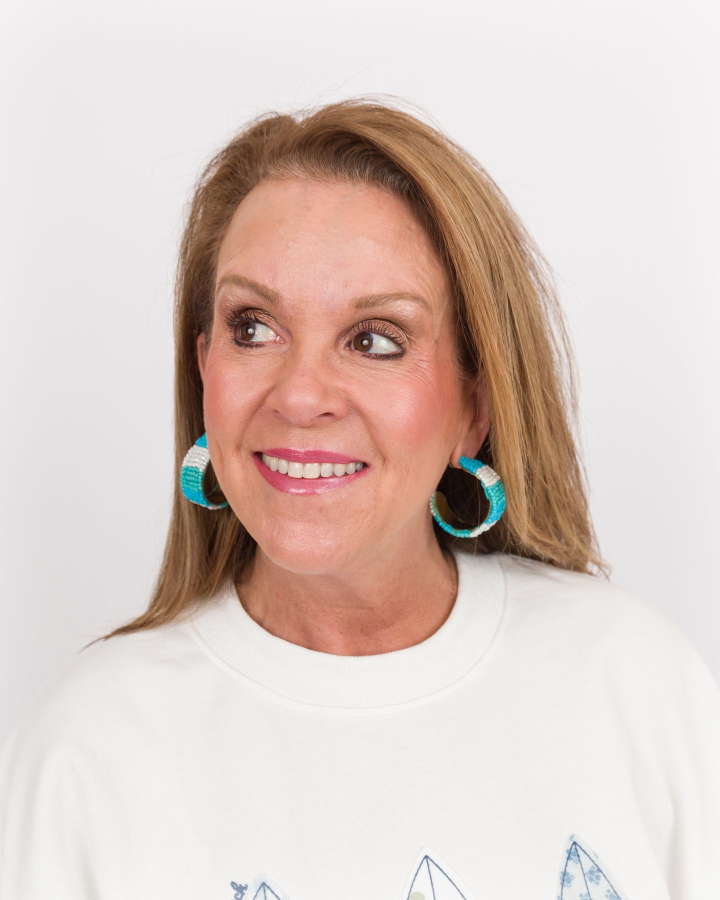 These striking blue color block beaded hoops combine geometric style with eye-catching detail, making them a versatile addition to any jewelry collection. The beaded accents add texture and dimension while the bold color blocking creates a modern, fashion-forward look. Perfect for elevating casual outfits or adding a pop of personality to your everyday accessories.