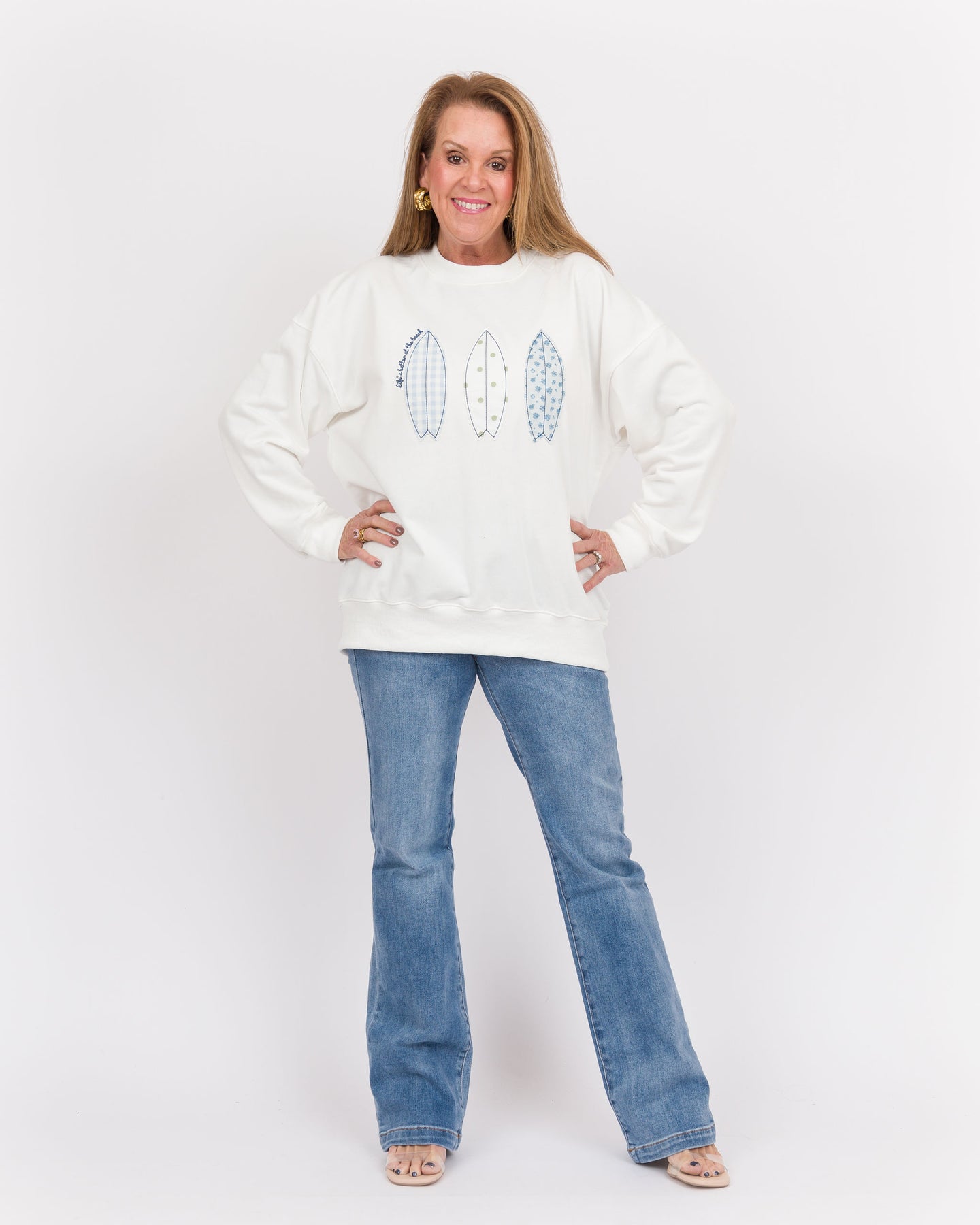 Elevate your casual wardrobe with this charming boat patchwork sweatshirt, featuring a unique mix of nautical-inspired fabric panels that add visual interest and personality to your everyday look. The relaxed fit and soft construction make it perfect for layering or wearing solo, whether you're heading to the coast or staying cozy at home. A versatile piece that effortlessly bridges the gap between comfort and style.