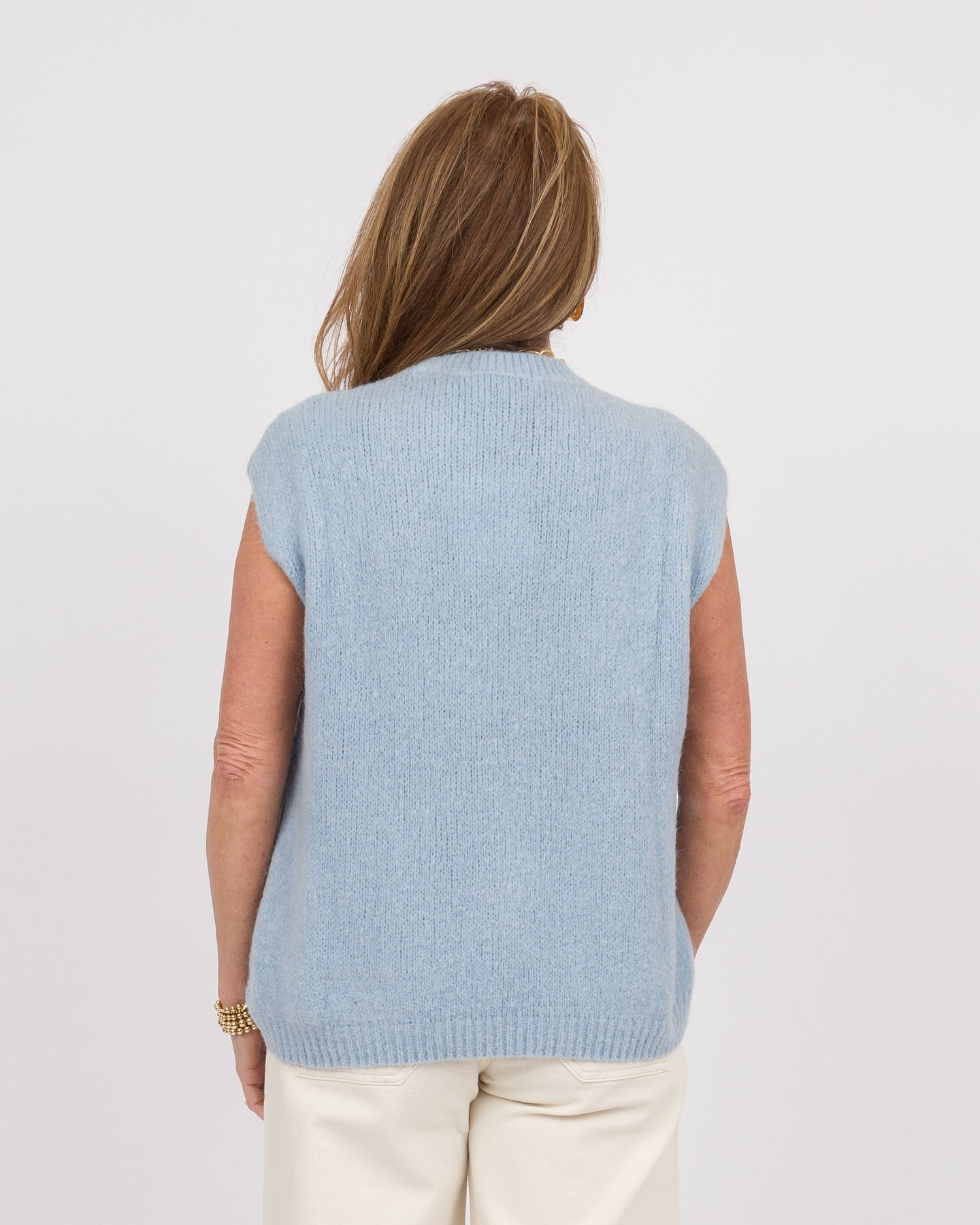 The Nadia Vest in light blue is a versatile layering piece that effortlessly transitions from casual to polished looks. Its soft fabric drapes beautifully while maintaining structure, making it perfect for pairing over dresses, tees, or blouses. Add this essential vest to your wardrobe for an instant style upgrade that works across seasons.
