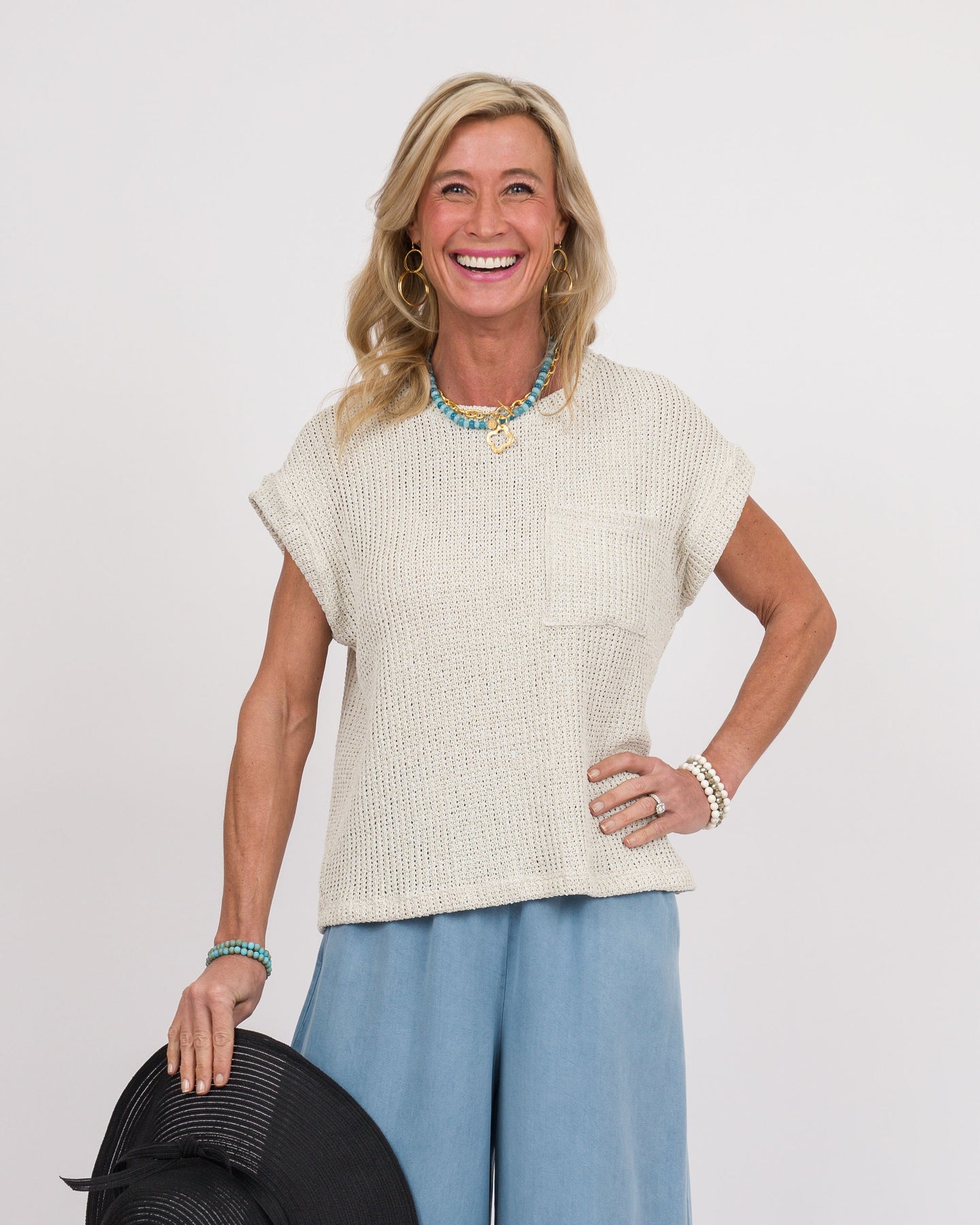 This versatile natural-toned top features a classic round neckline and short sleeves for effortless everyday wear. A functional front pocket adds practical style, making it perfect for layering or wearing solo. Simple, comfortable, and timeless—a wardrobe essential that works with everything.