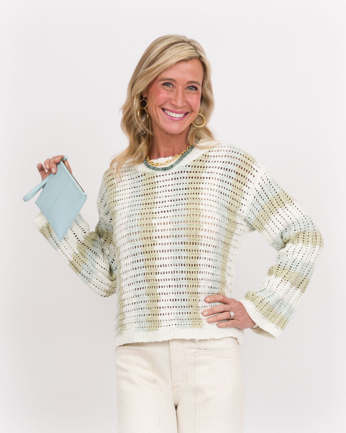 This lightweight striped sweater features a classic round collar and breathable fabric perfect for layering or wearing solo. The white, green, and blue stripe pattern adds visual interest to any casual wardrobe while remaining versatile enough to pair with jeans, skirts, or trousers. Ideal for transitional seasons, this piece delivers comfort and style without the bulk.