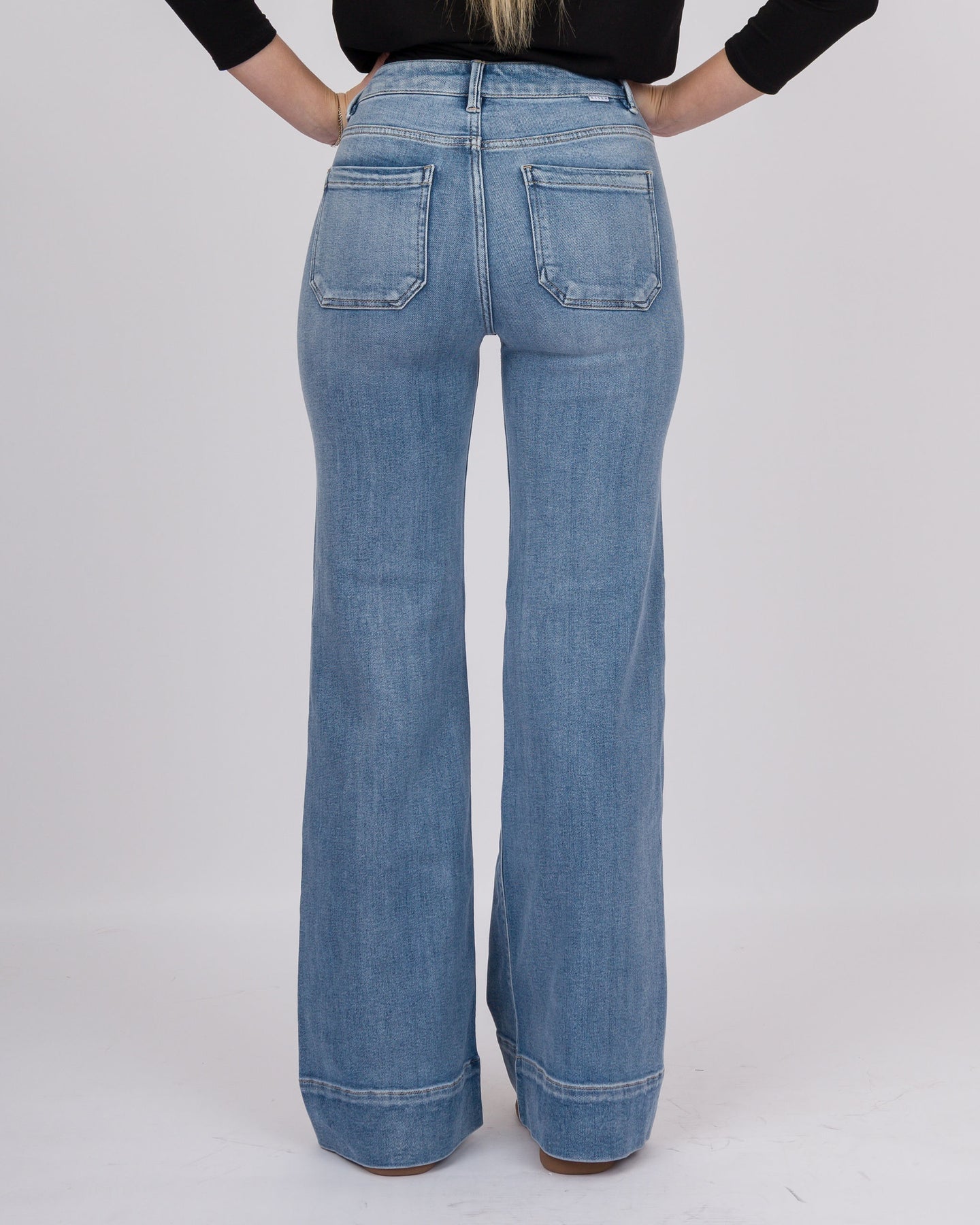 Unleash your adventurous spirit with Risen High Rise Wide Flare Patch Pocket Jeans! Conquer any challenge in style with these jeans that feature a high rise waist and wide flare legs. With patch pockets for added functionality, these jeans will take your fashion game to new heights.