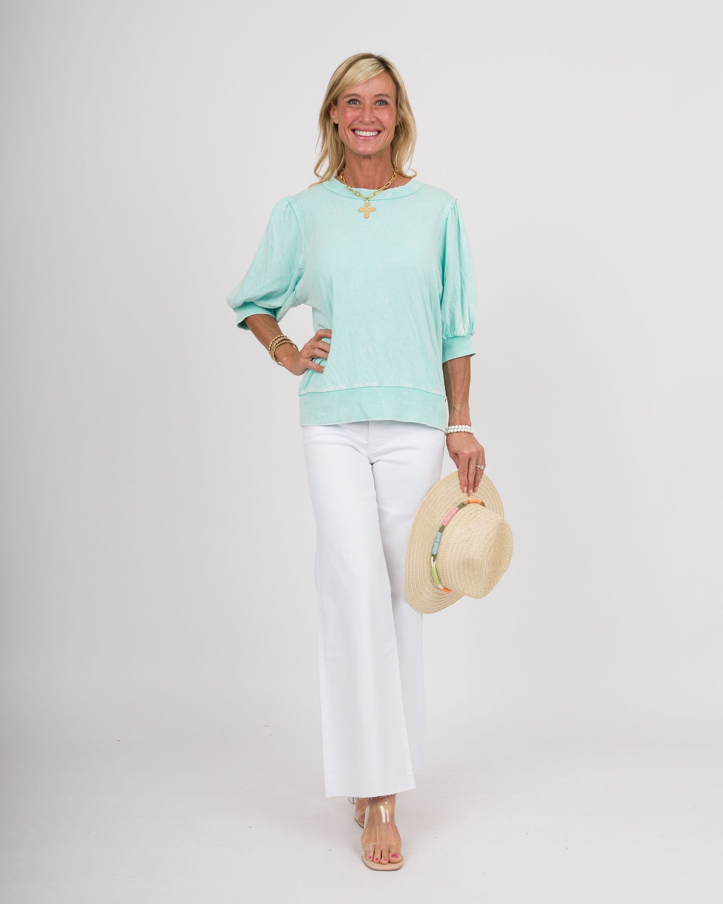 Effortless comfort meets contemporary style with this mineral-washed relaxed knit top. Featuring soft bubble sleeves, a rounded neckline, and a loose silhouette, it's designed for all-day ease. Ribbed hems and cuffs provide a polished finish while maintaining that coveted laid-back aesthetic. Perfect for casual layering or standalone wear.