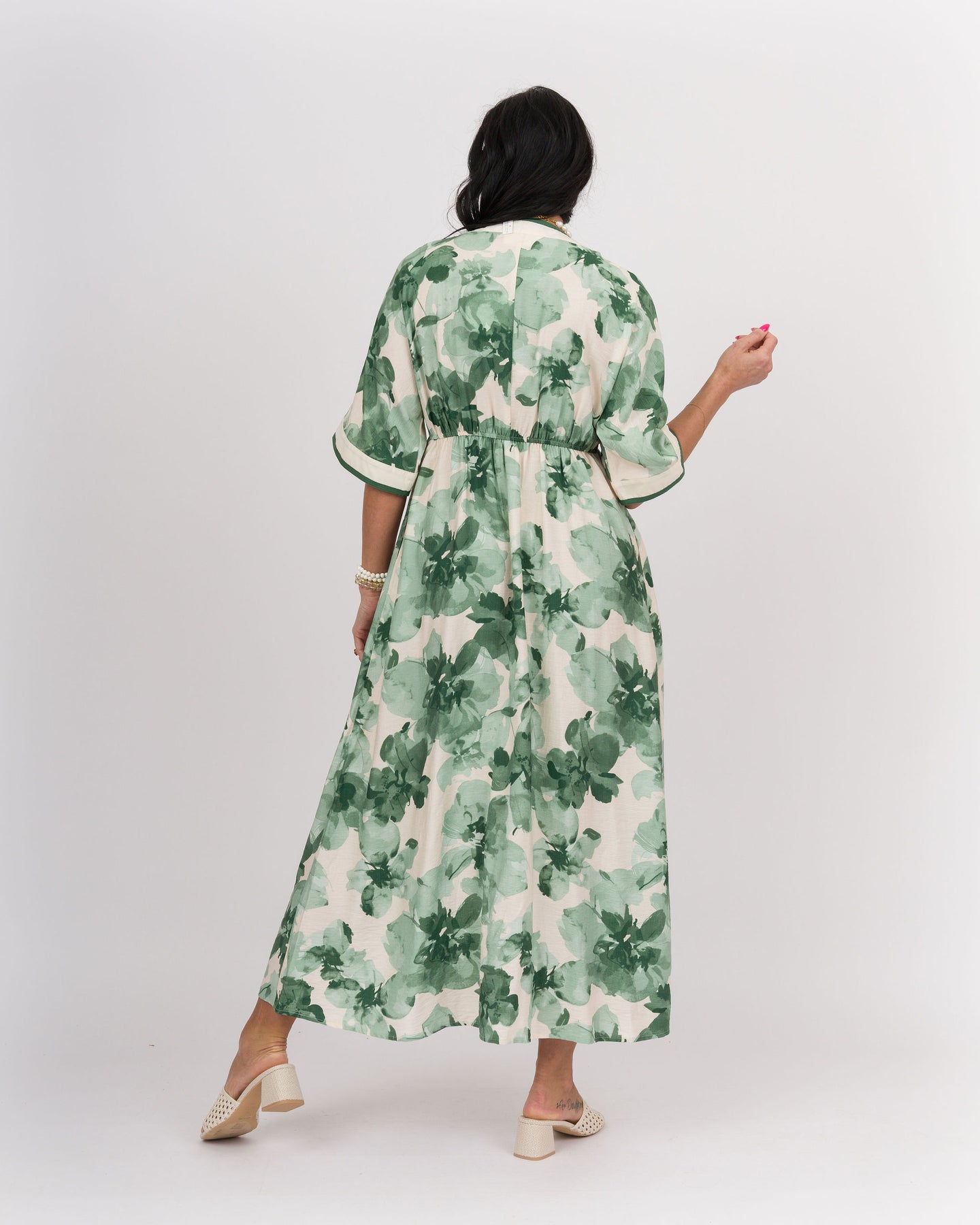 Effortless floral midi dress designed for everyday elegance. The front zipper and contrast trim add modern detail, while half kimono sleeves and a relaxed fit create a flattering silhouette. Lightweight rayon blend fabric drapes beautifully, and functional side pockets make it practical for any occasion. True to size for a comfortable, flowing wear.