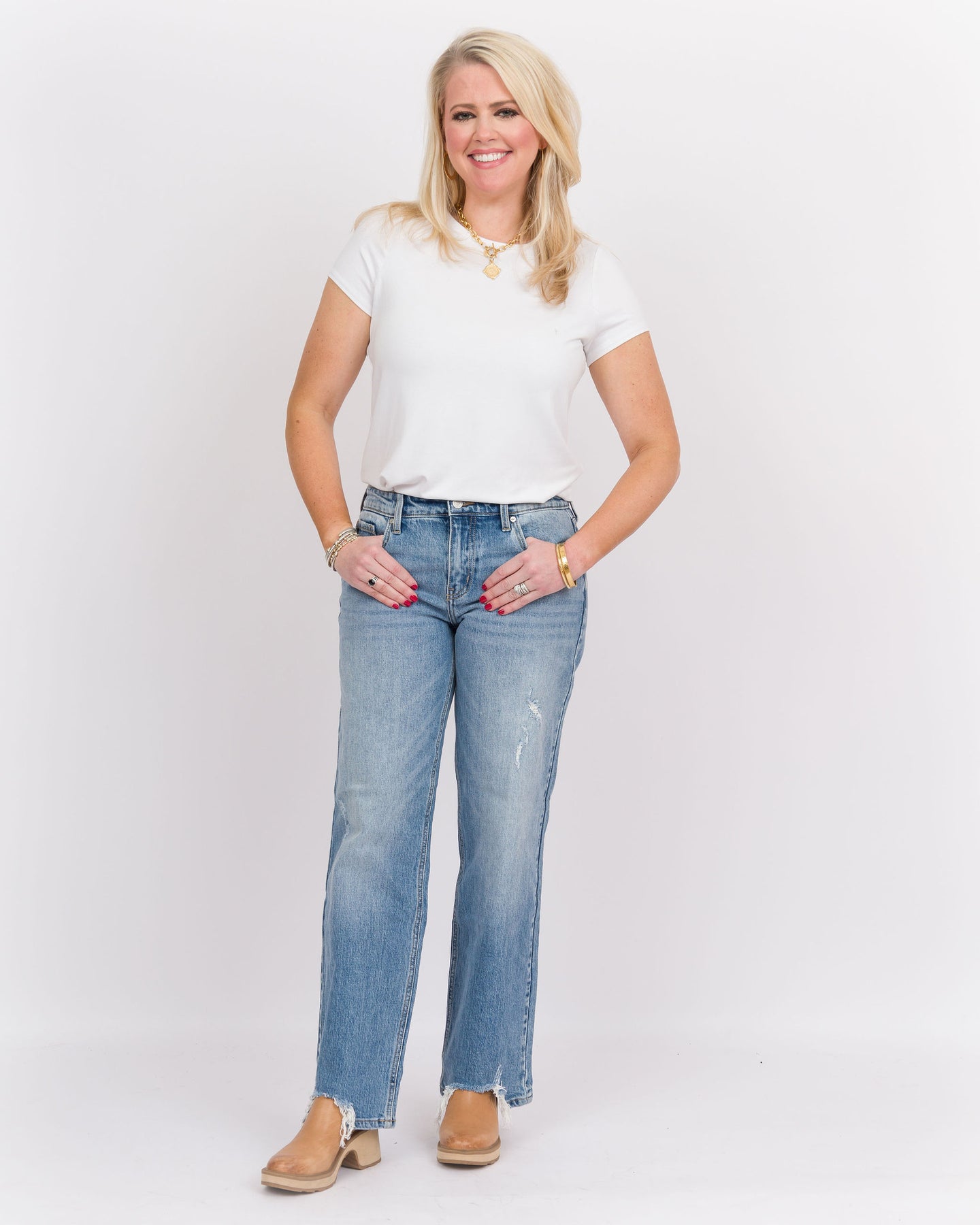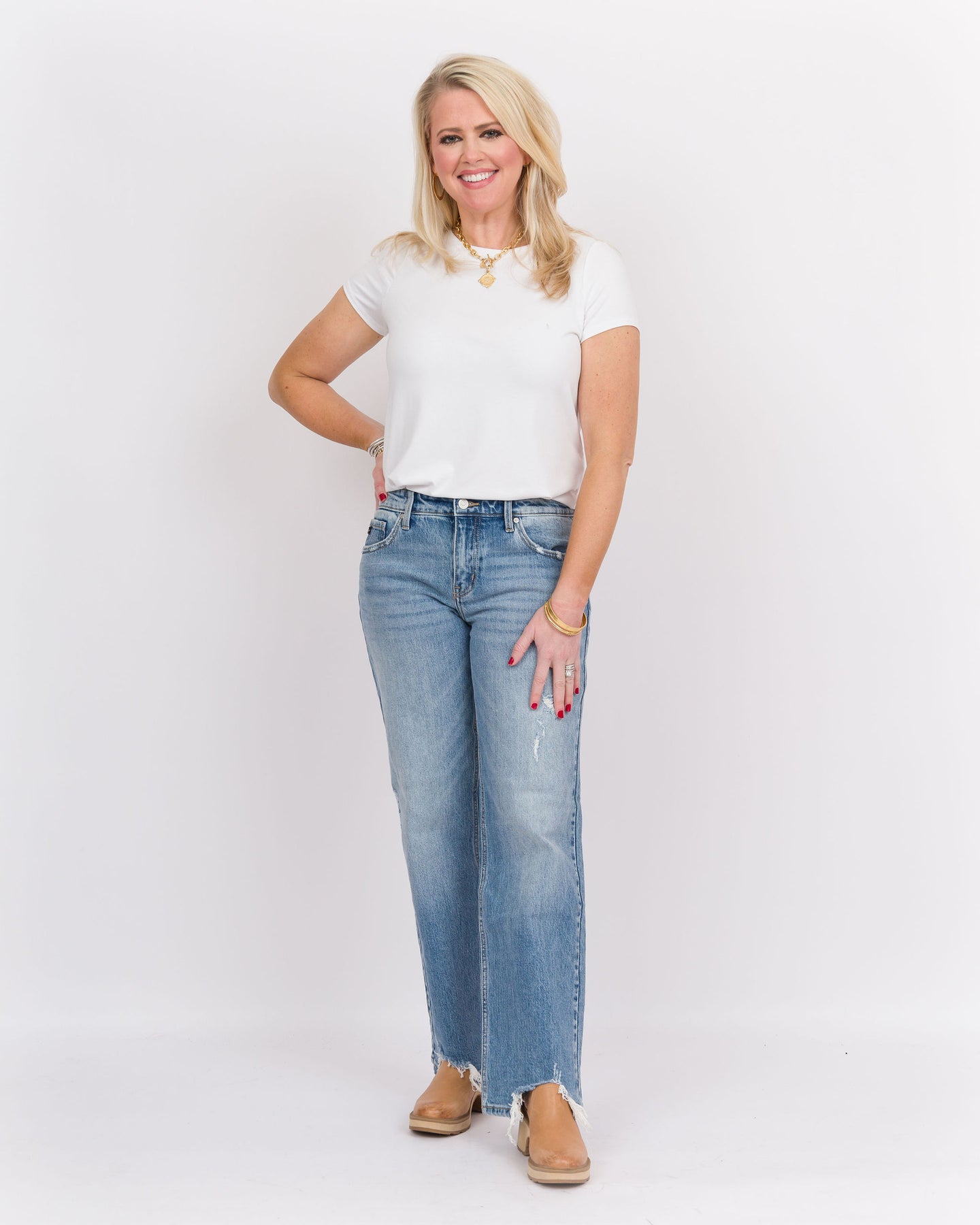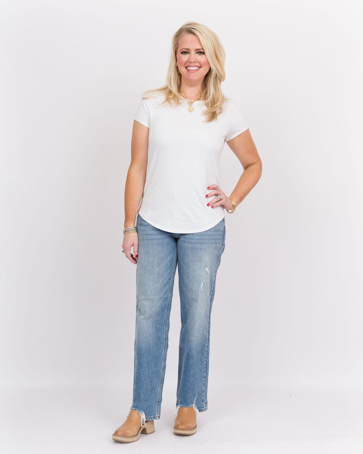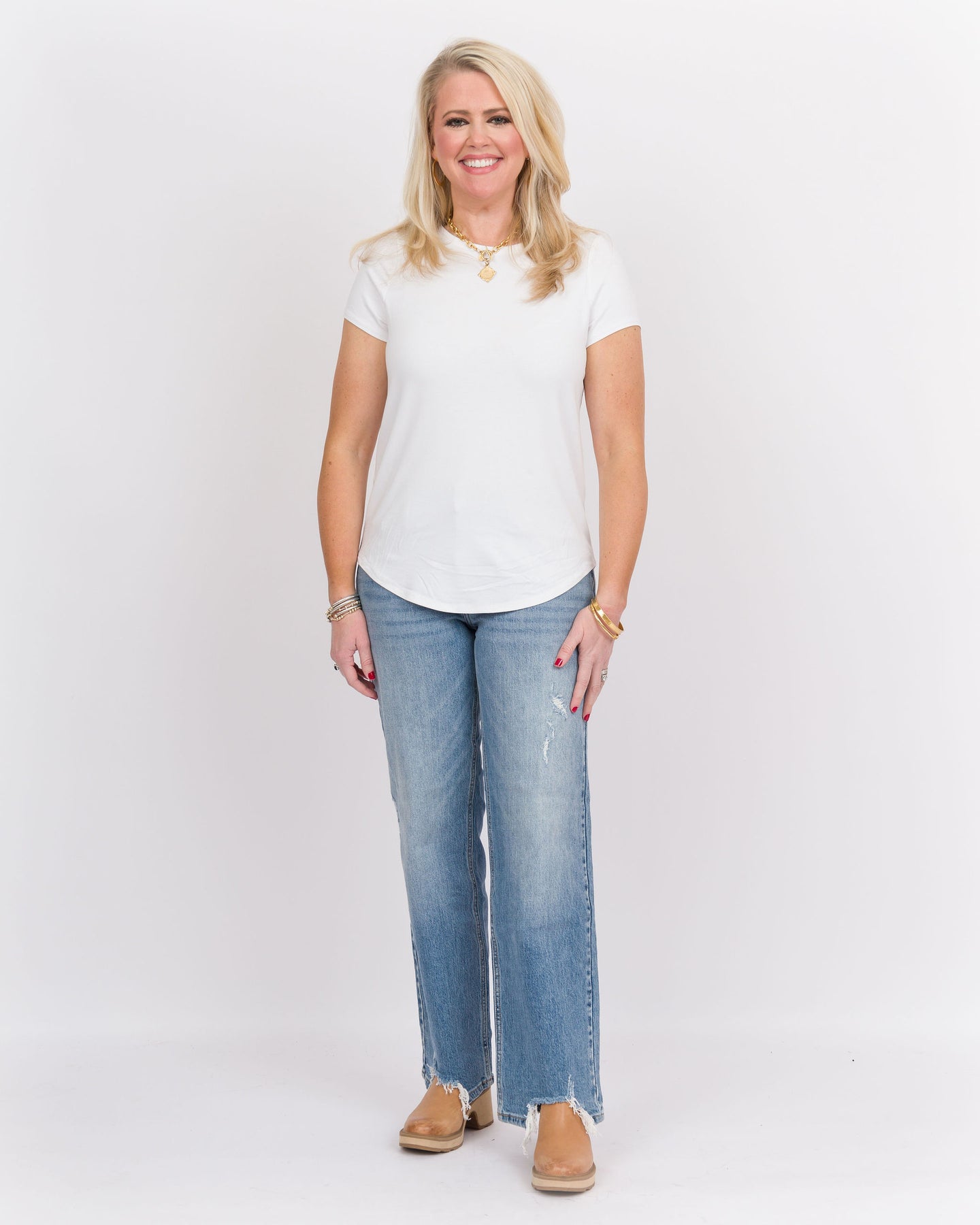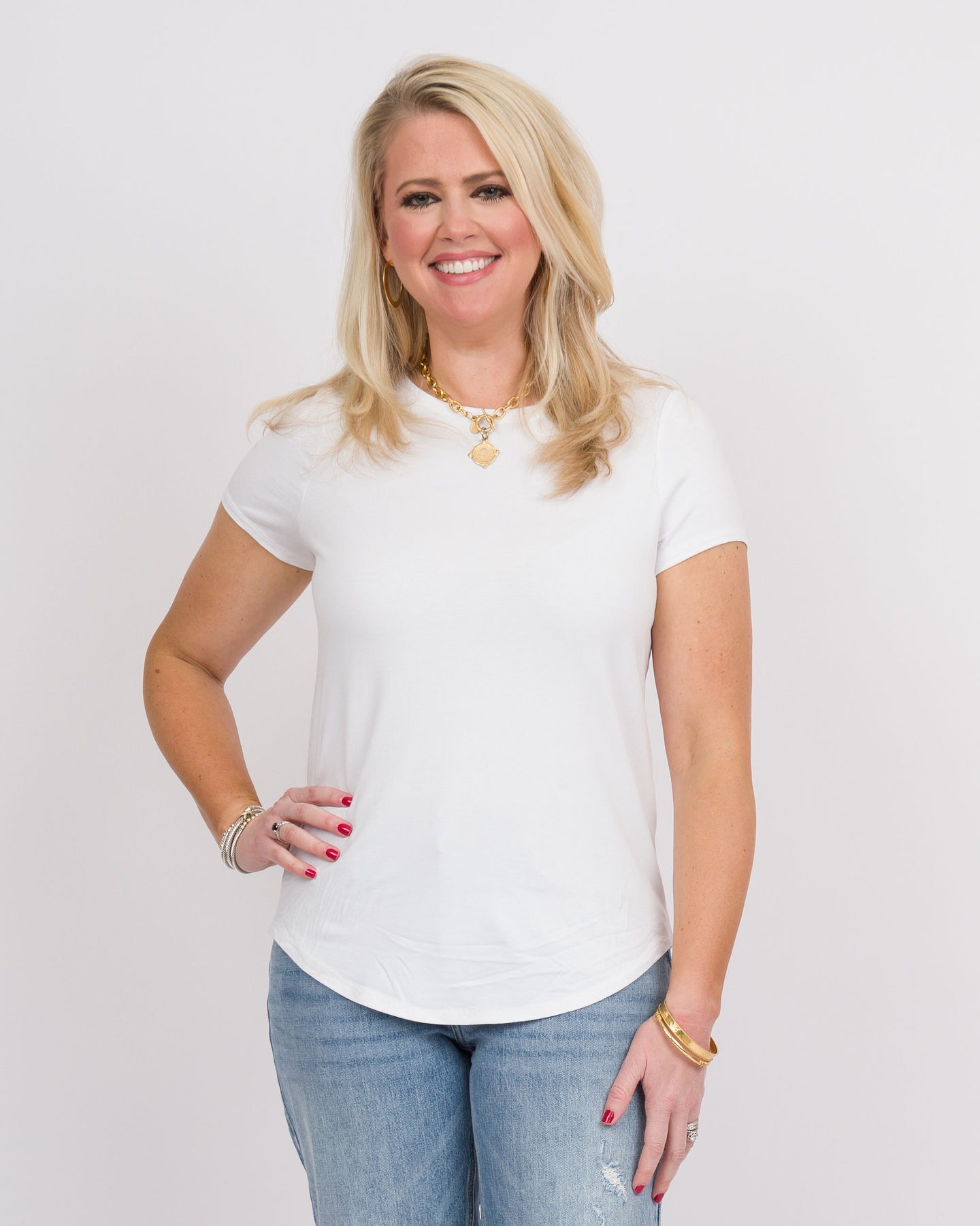 Experience the ultimate comfort with our Hi-Lo Tee in White. Short sleeves and a crew neck offer a classic look while the hi-lo hem adds a fun touch. Designed for a regular fit, this tee is lightweight and stretchy, making it perfect for everyday wear. Enjoy a loose cut for maximum comfort.