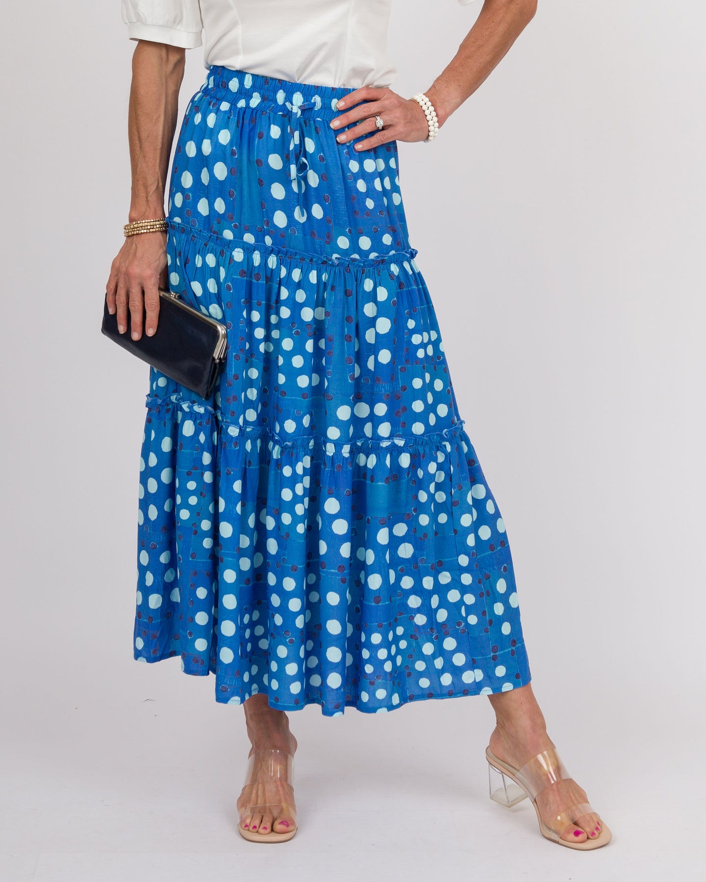 Elevate your summer style with our Verbena Dot Print Tiered Skirt! The lightweight fabric and flowy tiers make it perfect for hot days. Pair it with a cute top and sandals for a chic look that's as comfortable as it is stylish.