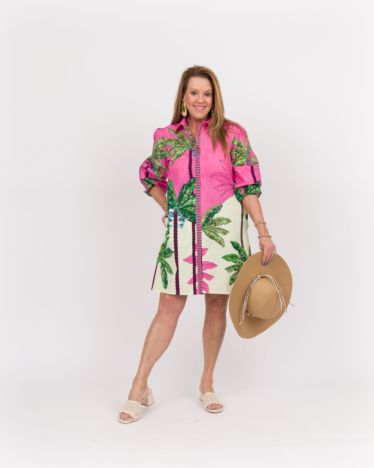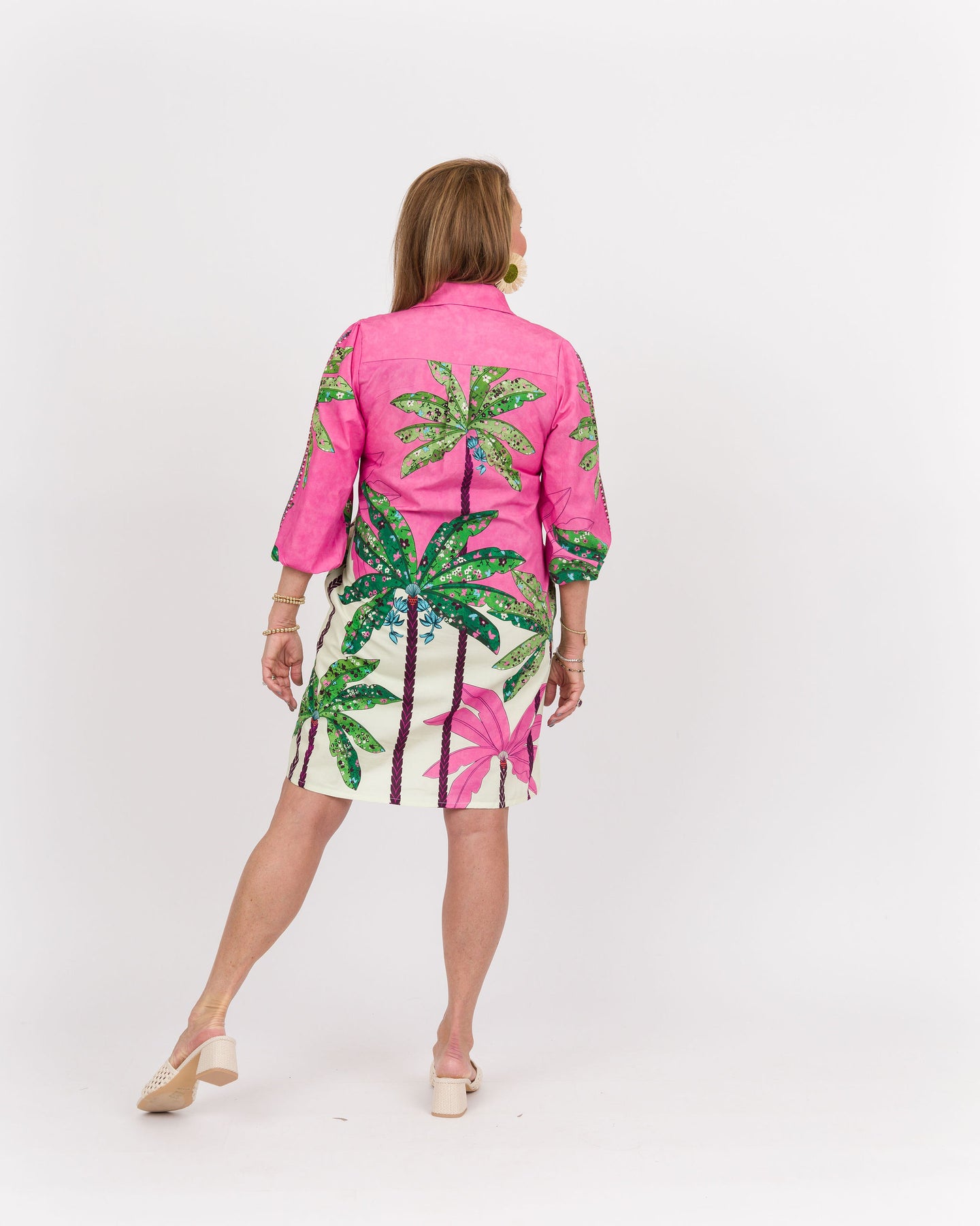 The Ava Dress Pink Tropics features a stylish button-down collar and elastic sleeves, creating a comfortable yet polished look. Its unique mosaic pattern adds a vibrant touch perfect for any occasion. Designed for ease and elegance, this dress effortlessly blends fashion with function.