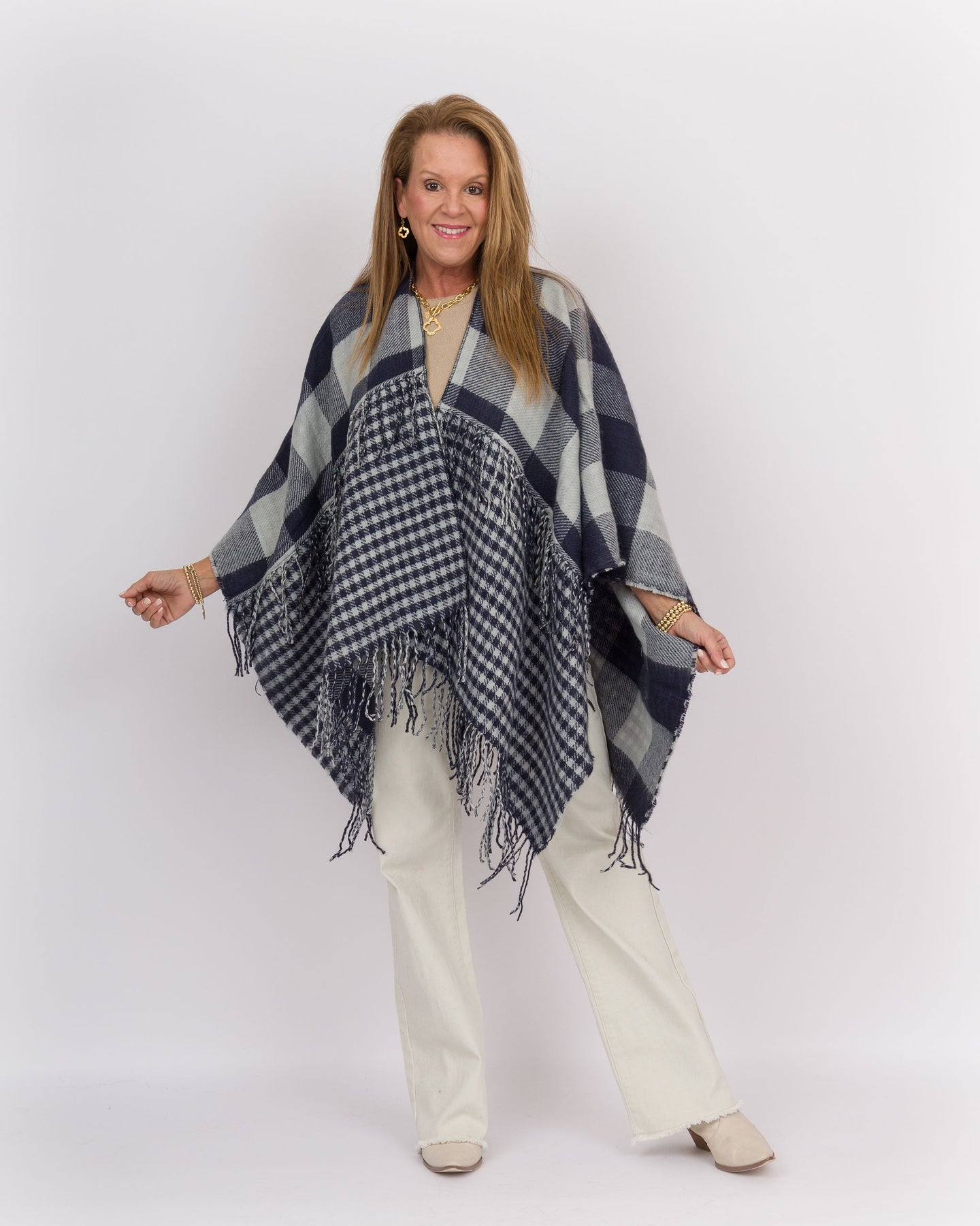 Stay cozy and chic with our Plaid Fringe Wrap in Navy. This versatile accessory adds a touch of style to any outfit, while also keeping you warm and comfortable. Perfect for those chilly days or when you want to add a pop of color to your look.