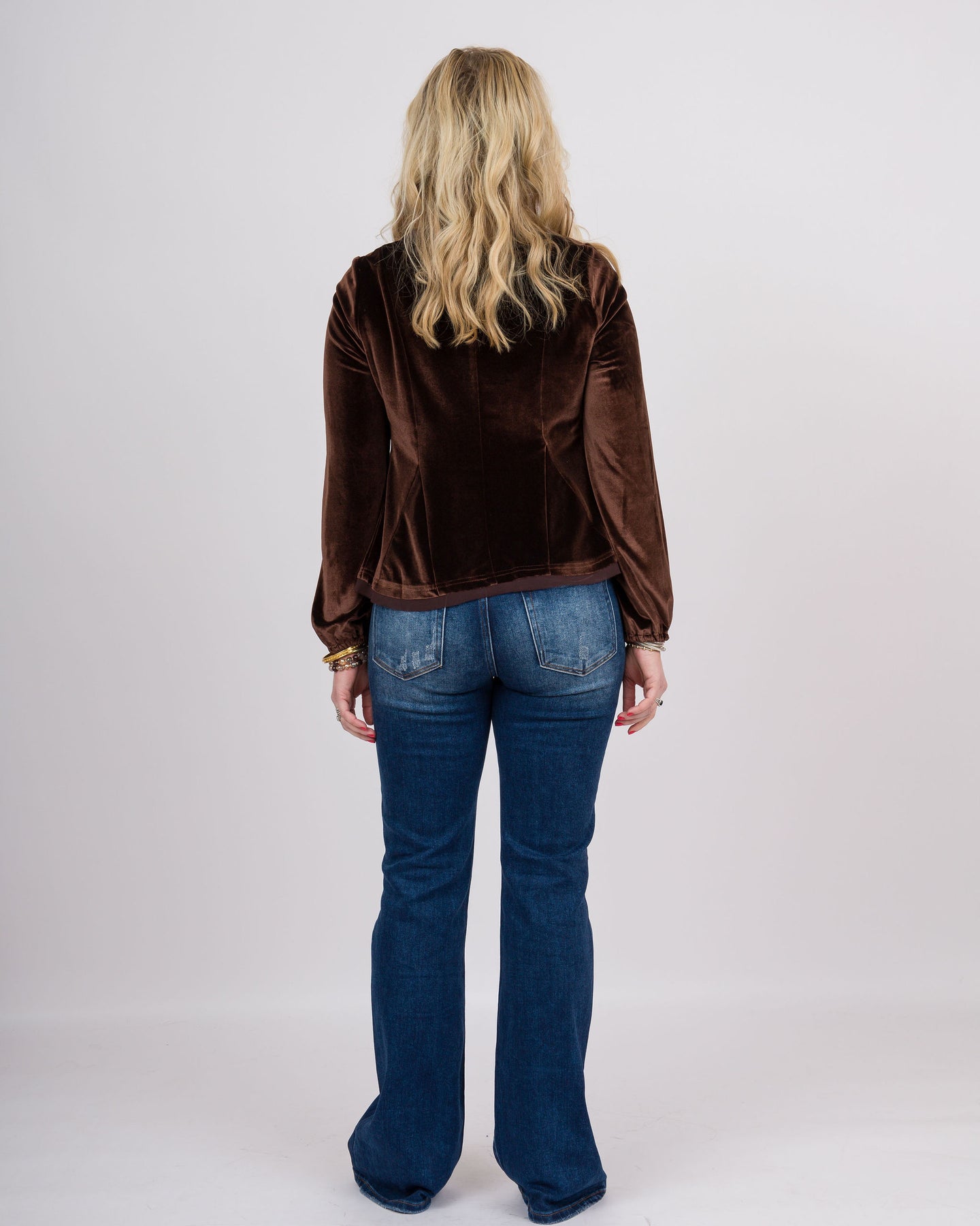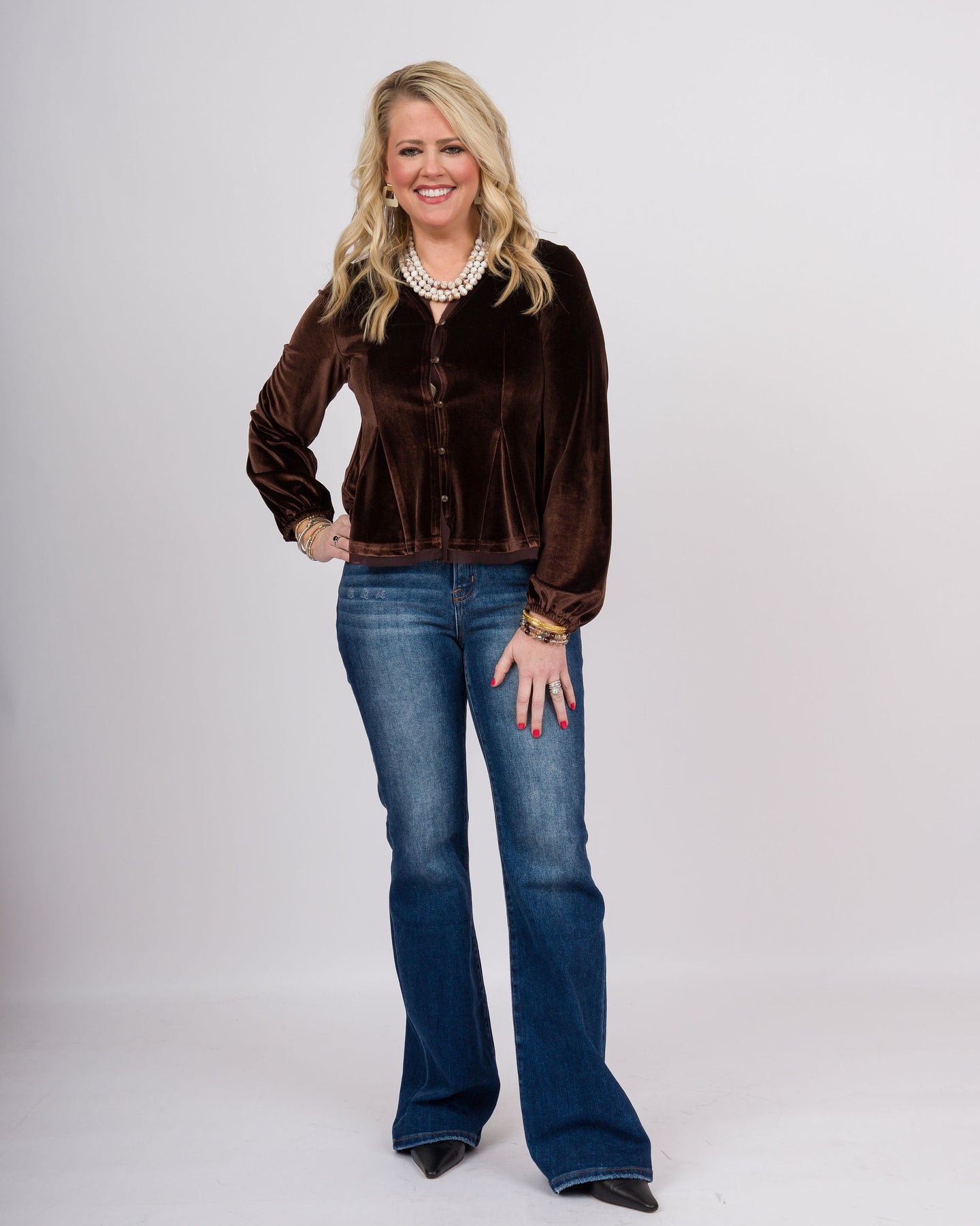 Luxurious and sophisticated, this blouse pairs rich velvet with delicate chiffon accents for a striking contrast. The soft velvet body drapes beautifully, while chiffon details add lightness and movement.