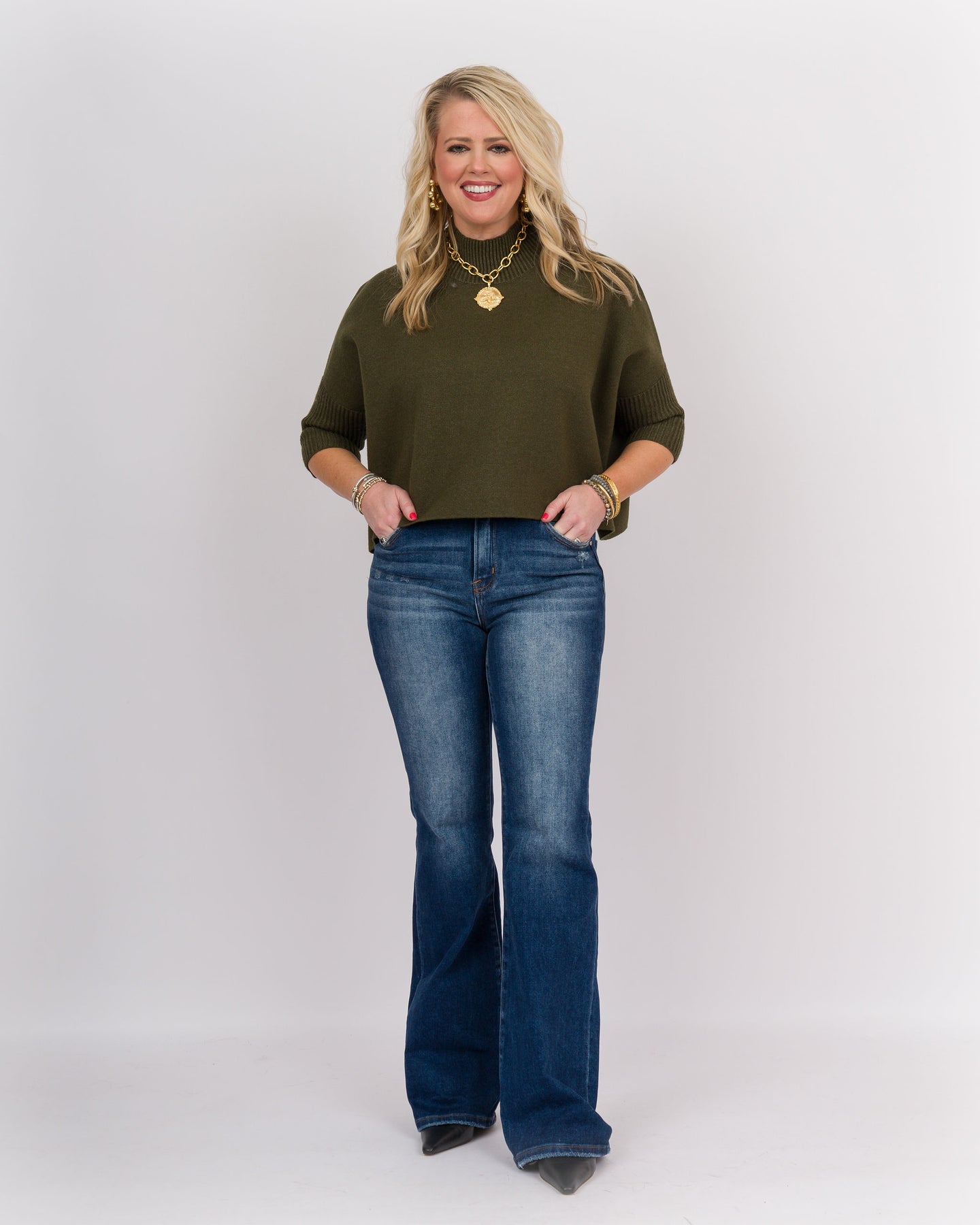 The Kerisma "Aja Sweater-Olive" is an oversized boxy sweater featuring a fitted ribbed turtleneck line. This sweater also features 3/4 length sleeves, this top is a must have this season!