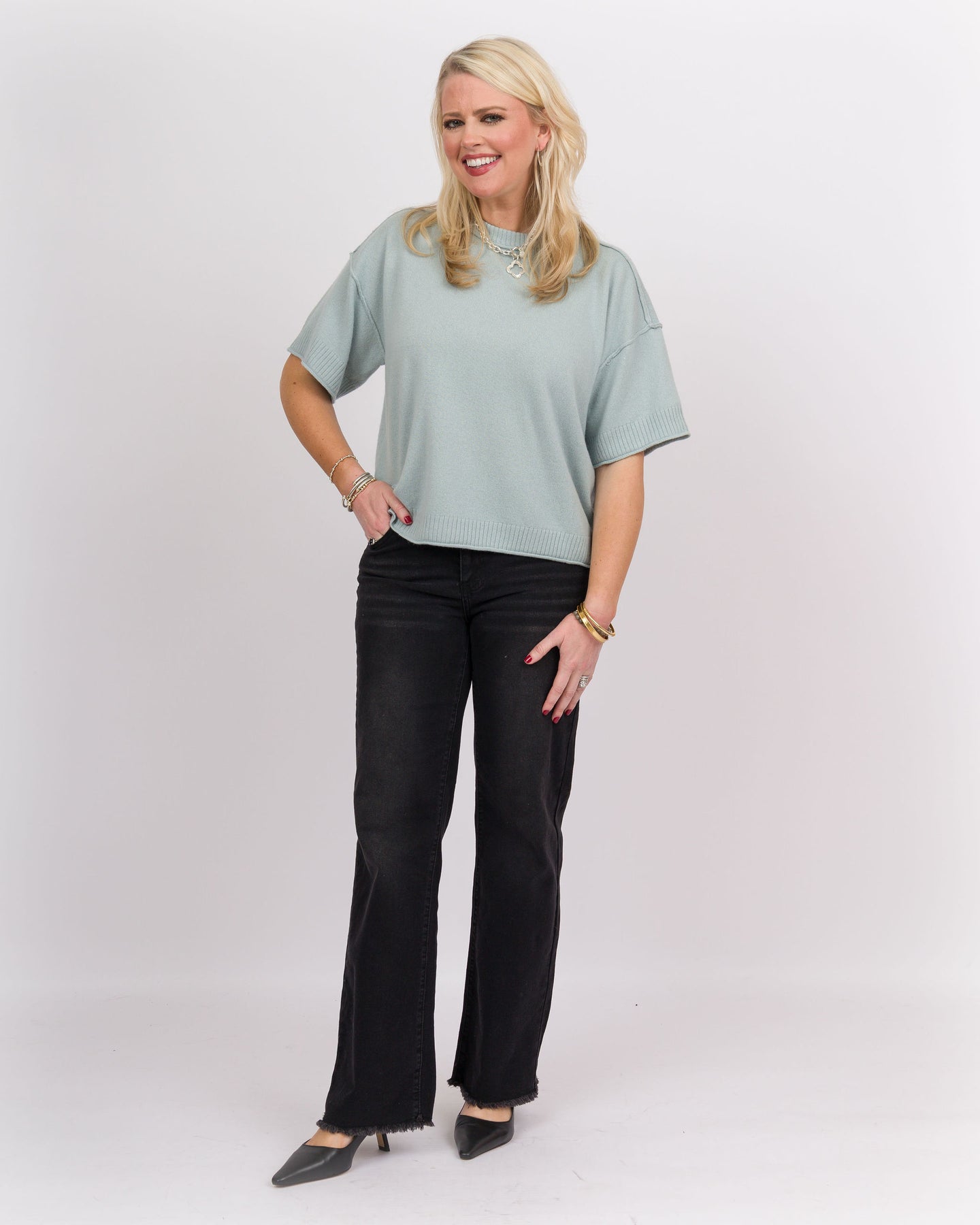Elevate your everyday wardrobe with this luxuriously soft cashmere blend sweater, featuring a relaxed drop shoulder silhouette that effortlessly flatters any frame. The short sleeves and gentle mint hue make it perfect for layering or wearing solo during transitional seasons. Crafted from premium materials, this versatile piece transitions seamlessly from casual outings to cozy evenings at home.