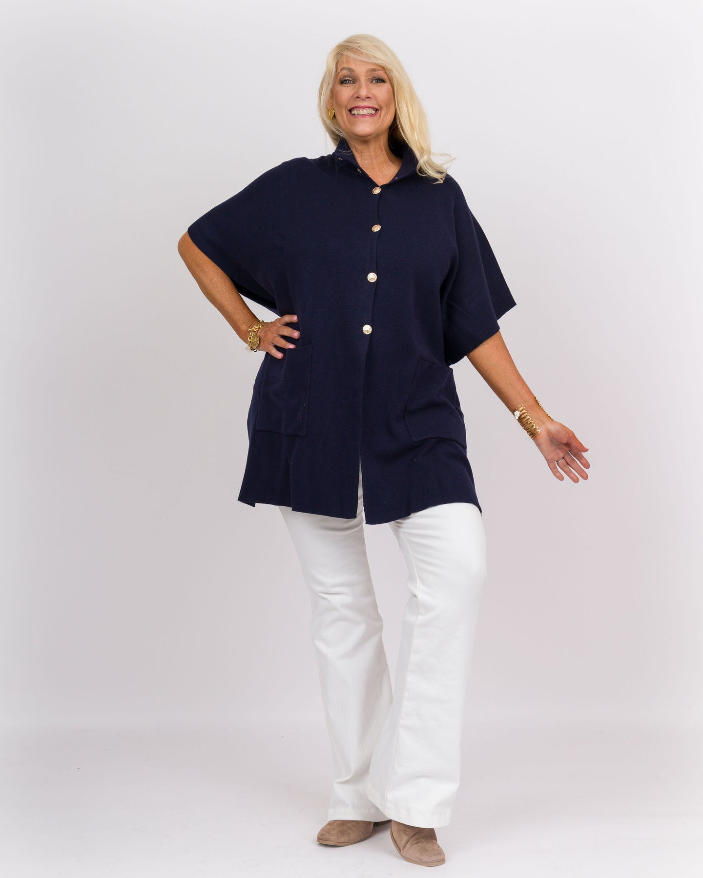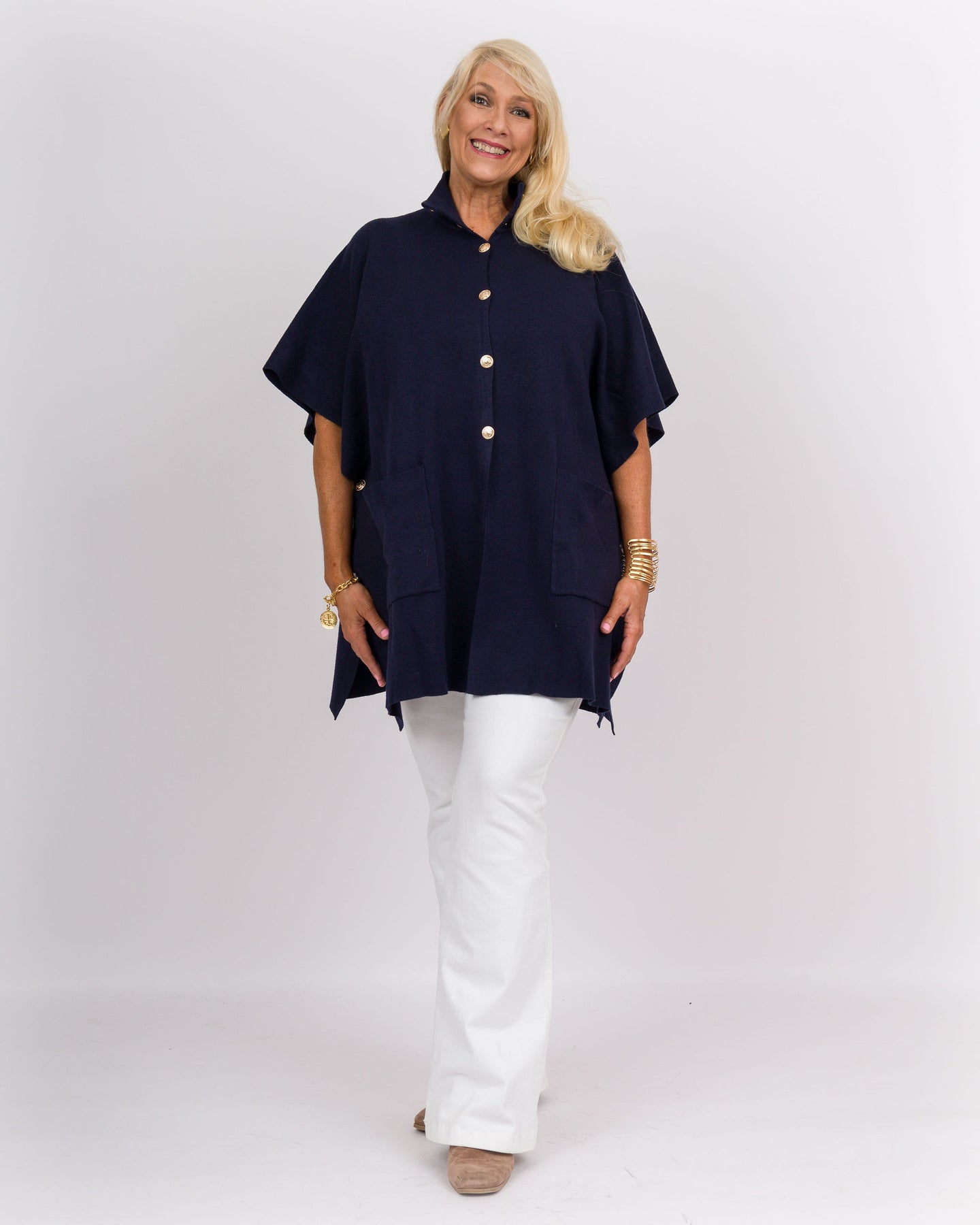 This elegant navy cape features striking gold buttons that add a touch of sophistication to any outfit. The timeless color and classic silhouette make it a versatile layering piece perfect for elevating casual or formal looks. Drape it over your shoulders for an instant style upgrade that works season after season.