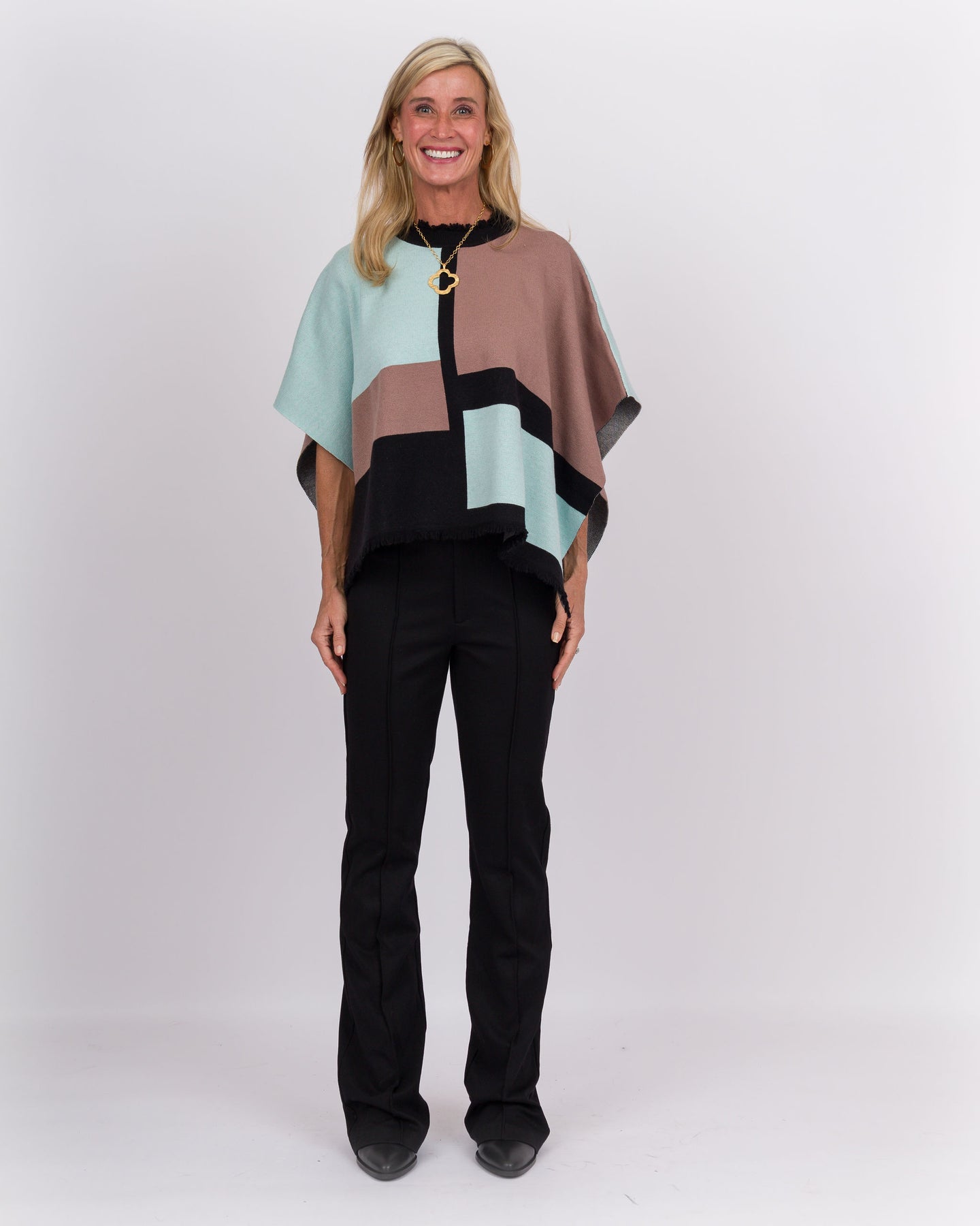 Elevate your layering game with this striking colorblock poncho, featuring a mock neck and playful fringe trim that adds movement and texture. The modern color blocking creates visual interest while the relaxed silhouette offers effortless style and comfort for any occasion. Perfect for transitional weather, this versatile piece pairs beautifully with jeans, leggings, or dresses for an instantly polished look.