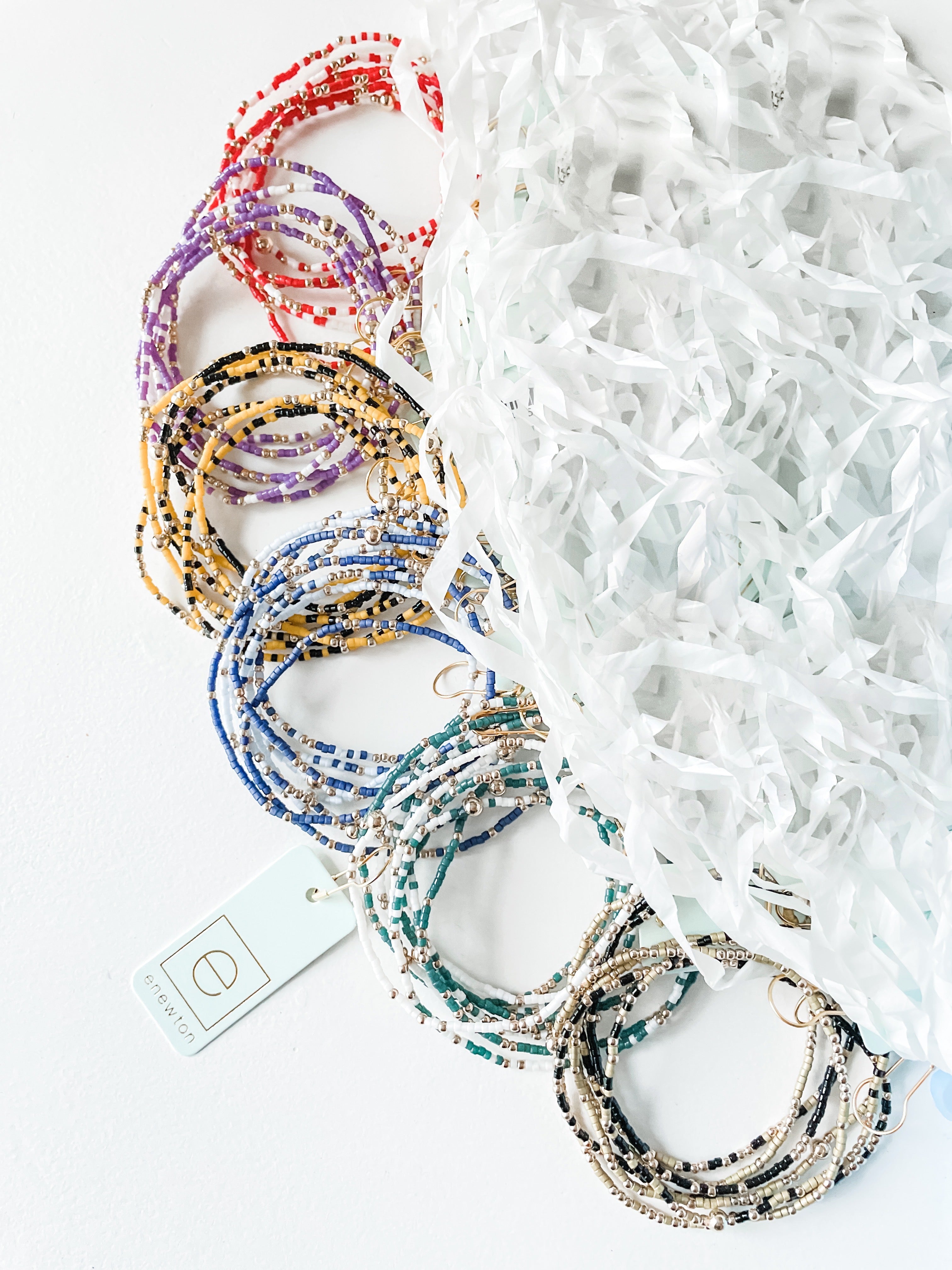 - Hand beaded on high performance elastic for a slight stretch to easily roll on and off your wrist