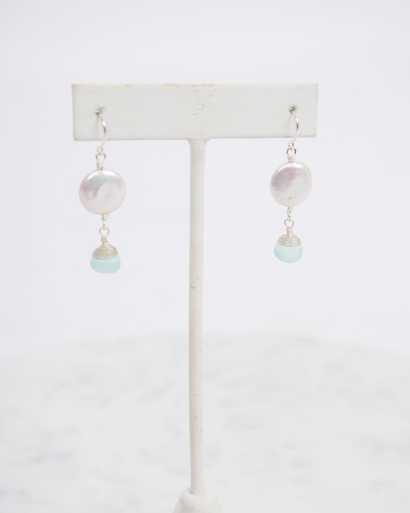 Classic-beauty earrings made with a select coin pearl and a small aqua chalcedony drop