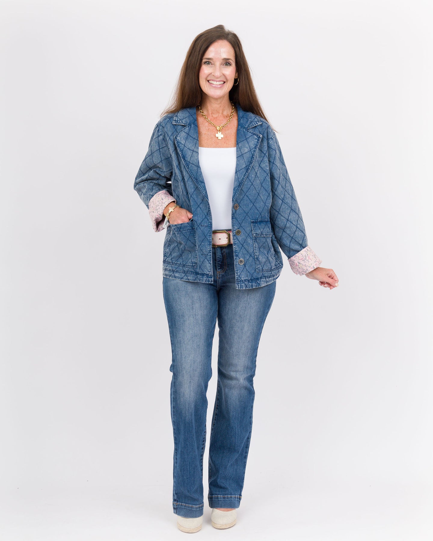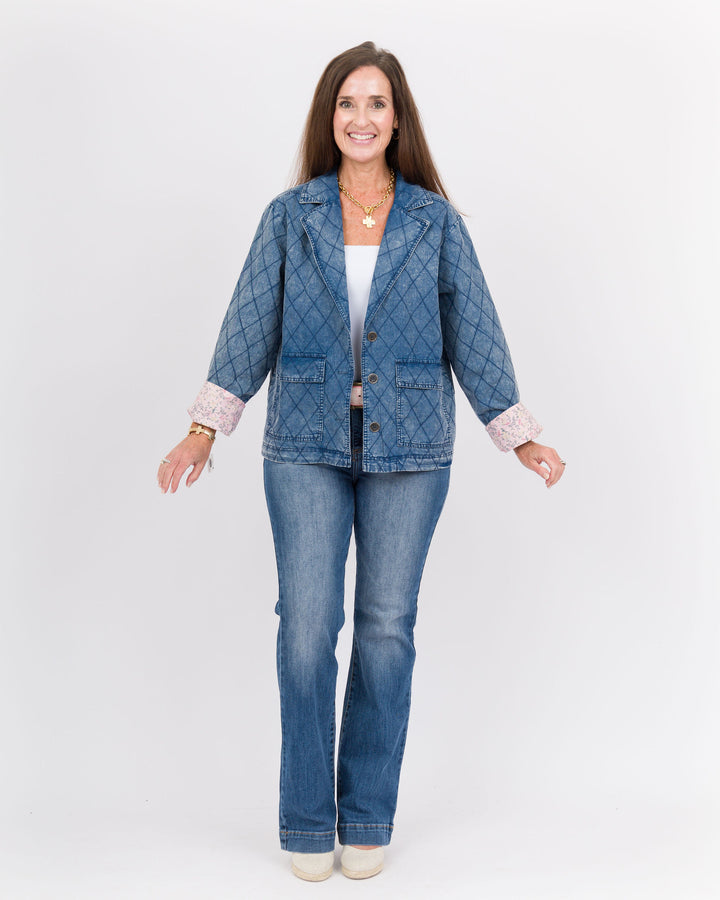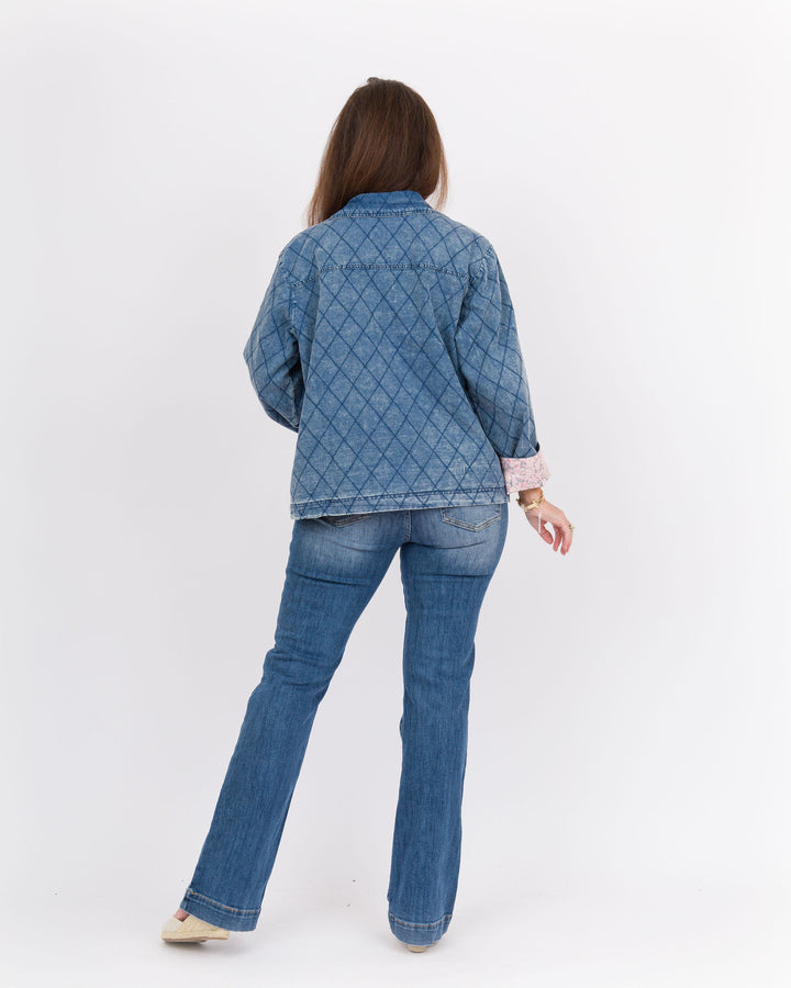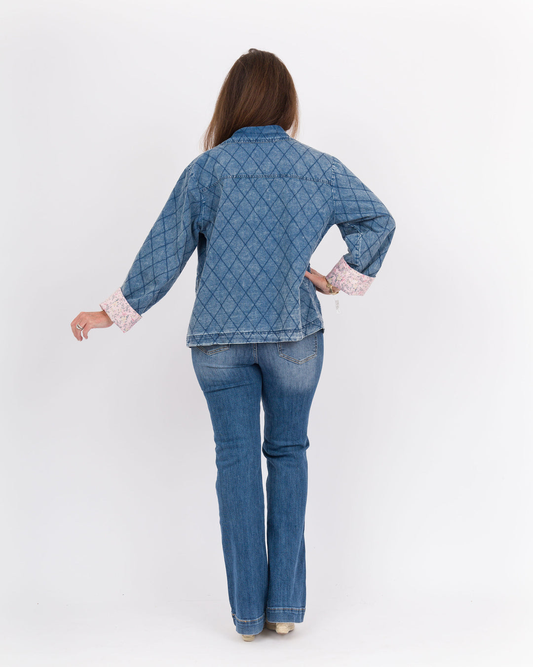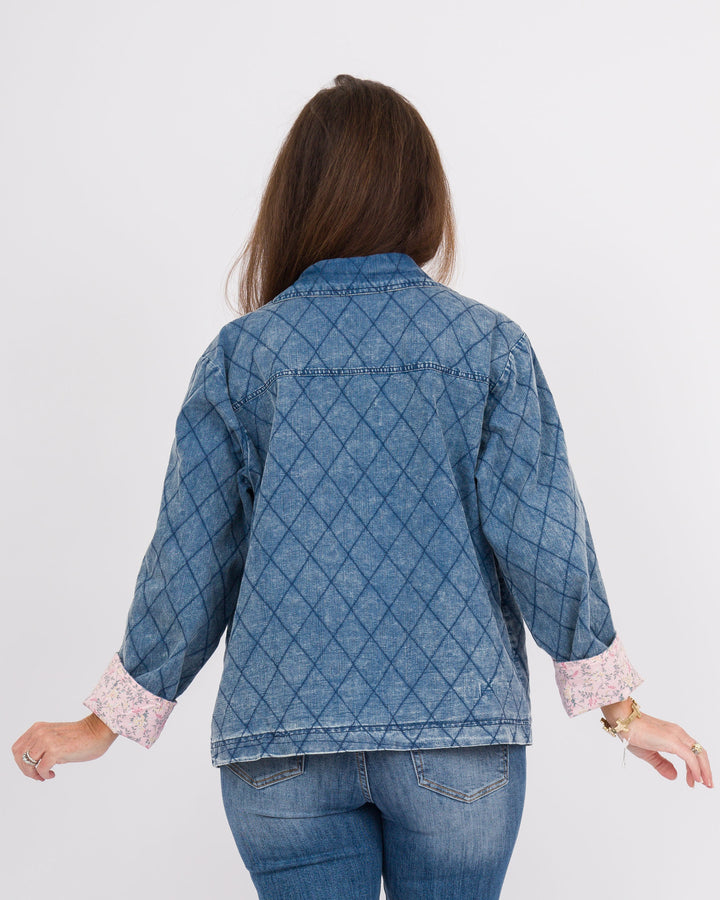This snow and enzyme washed long sleeve denim jacket features a quilted diamond stitched pattern, a relaxed fit, floral print lining with foldable cuffs, a lapel collared neck, and open front patch pockets, blending vintage charm with modern versatility.