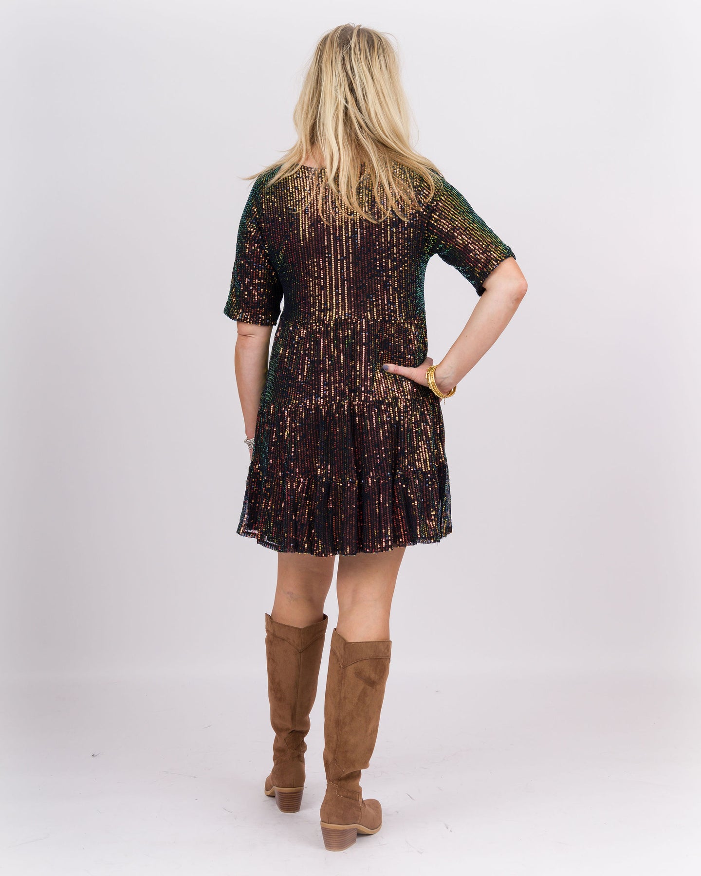 Elevate your evening look with this stunning sequin dress, featuring elegant 3/4 sleeves that strike the perfect balance between sophistication and style. The shimmering sequin fabric catches the light beautifully, making you the center of attention at any special occasion. Perfect for parties, celebrations, or nights out, this dress combines glamour with wearable comfort.