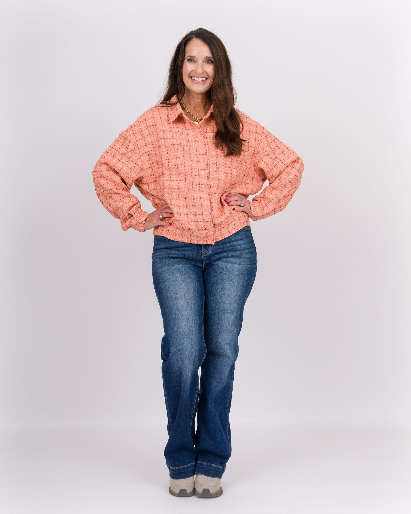This Tweed Coral Jacket combines timeless style with modern comfort, featuring a relaxed boxy silhouette that flatters any frame. The classic collared neckline and convenient snap button front make it effortless to wear, while the textured tweed fabric adds sophisticated texture and depth. A functional chest patch pocket completes the look, perfect for layering over your favorite pieces.